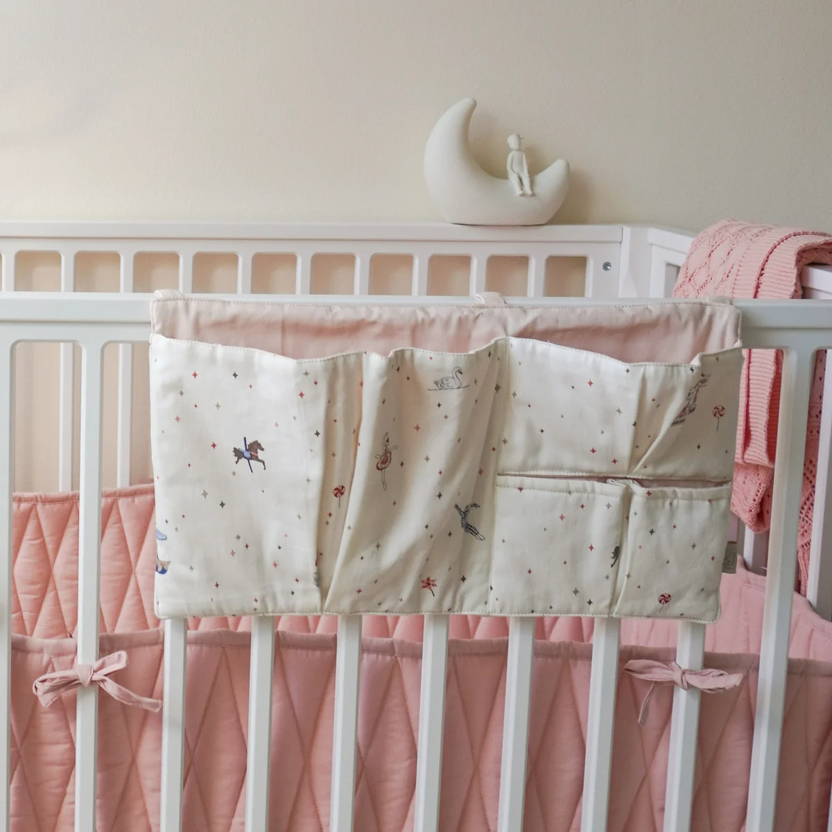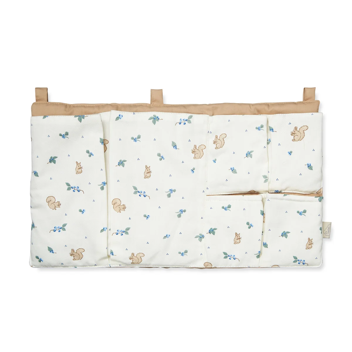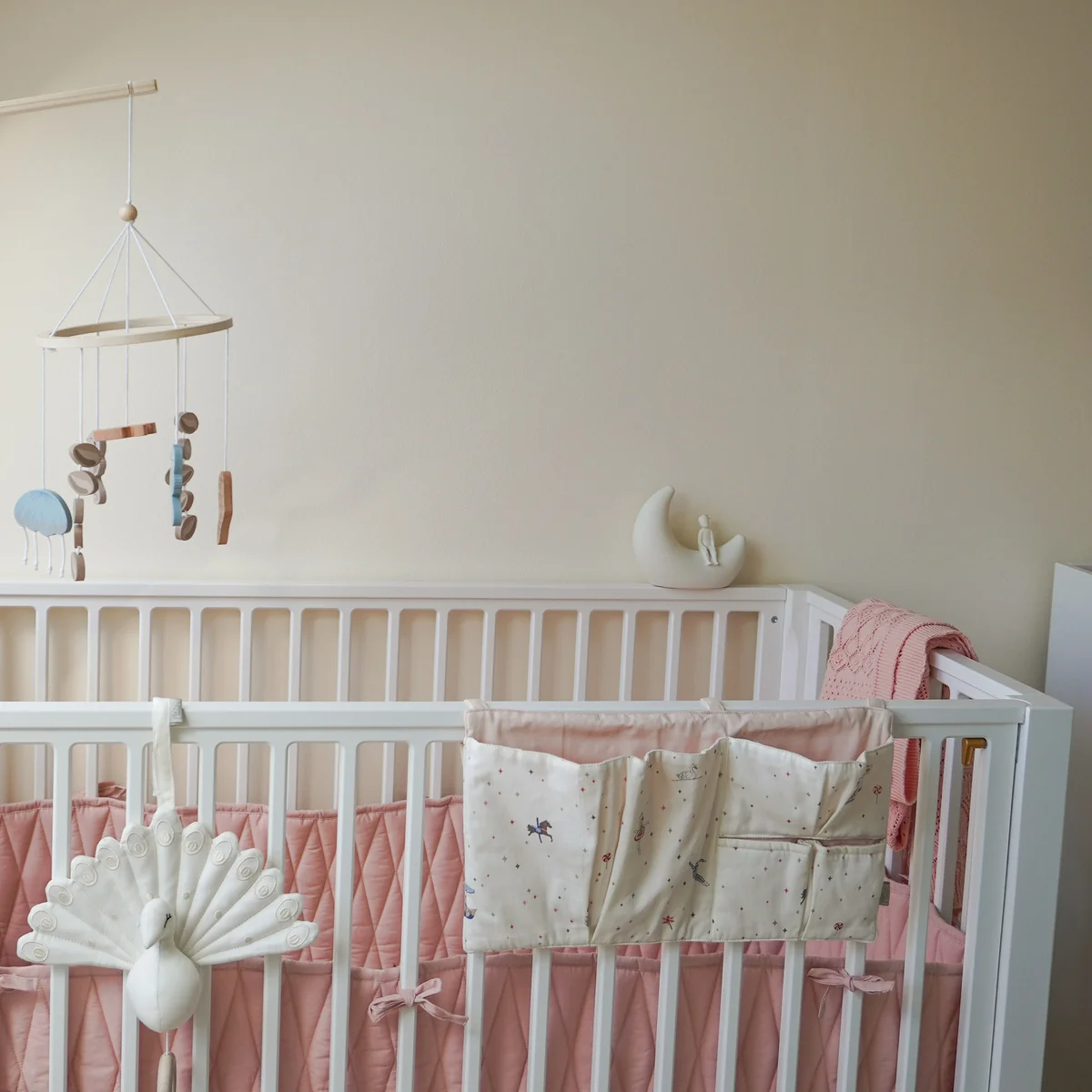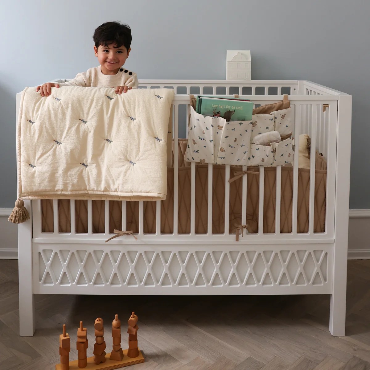 Die Betttasche von Cam Cam Copenhagen bietet eine stilvolle und praktische Lösung für zusätzlichen Stauraum im Kinderzimmer. Sie wird einfach am Baby- oder Kinderbett befestigt und sorgt für Ordnung, indem sie Platz für wichtige Dinge wie Schnuller, Kuscheltücher oder kleine Bücher schafft. Dank ihrer kompakten Größe von ca. 42 × 24 cm passt sie perfekt an Gitterbetten und lässt sich mühelos in das Design des Zimmers integrieren.