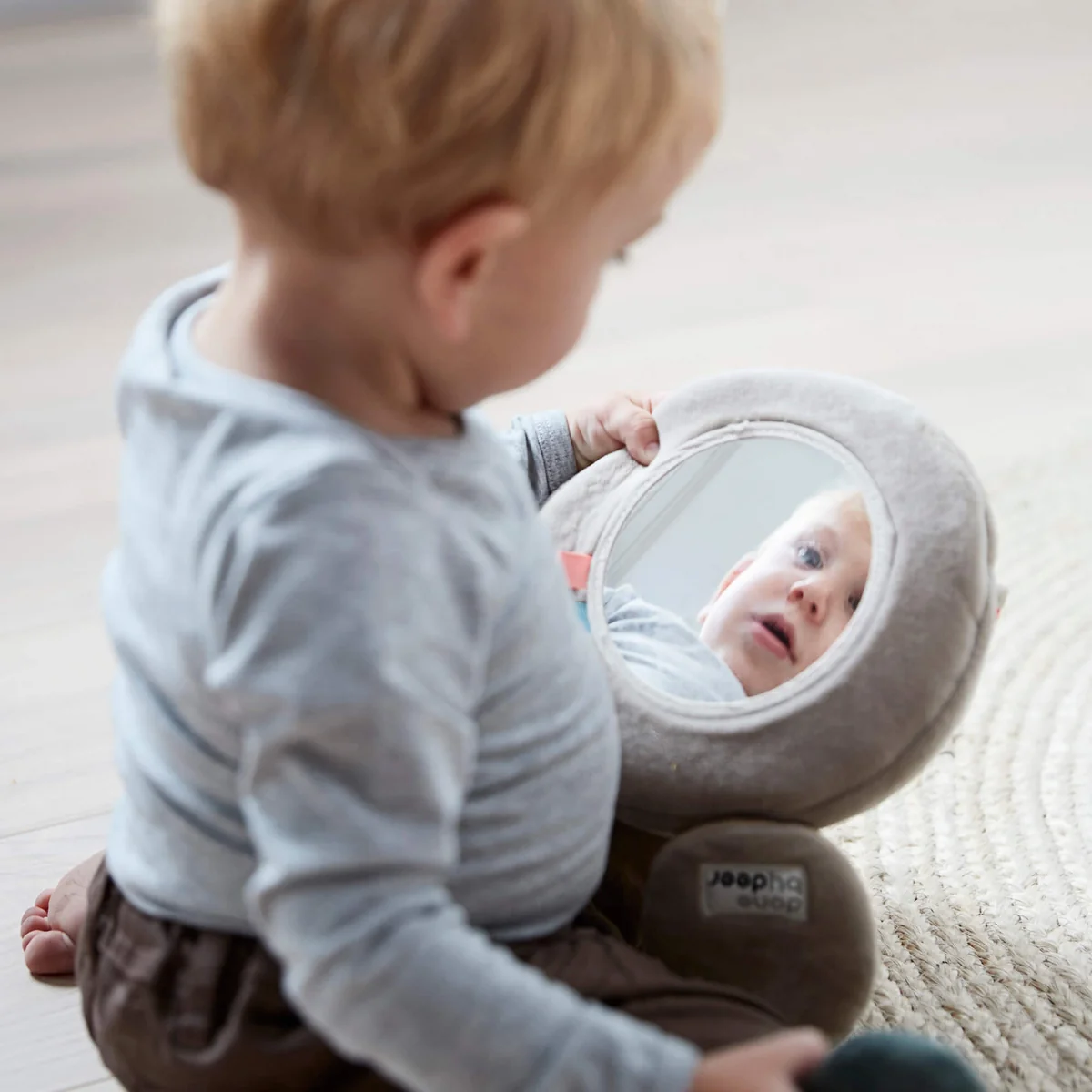 Das Versteckspiel des dänischen Herstellers Done by Deer fördert auf spielerische Weise die Entwicklung der Hand-Augen-Koordination und Konzentrationsfähigkeit. Verschiedene Texturen und Formen können erfühlt und erforscht werden. Die Tür der kleinen Höhle kann geöffnet werden. die kleinen Kuscheltiere knistern und rascheln. Unterhalb des Bergs befindet sich ein niedlicher, runder Spiegel.