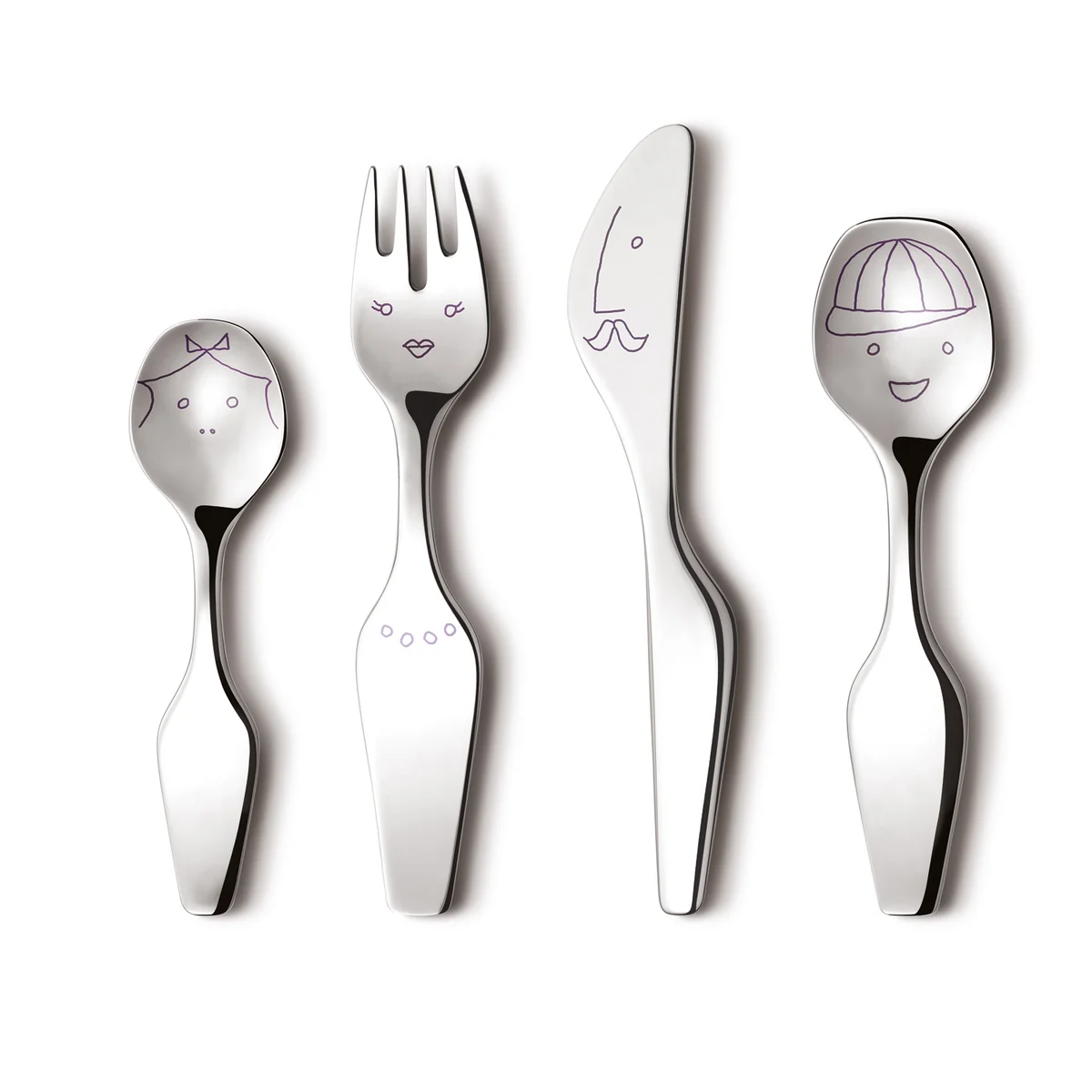 Essen lernen mit Spaß: Jedes Mitglied des wunderbaren Alfredo Kinderbestecks ist das Ergebnis der handgefertigten Skizzen von Mutter, Vater, Sohn und Tochter – alle aus der kreativen Hand des Designers Alfredo Häberli. Das Alfredo Kinderbesteck ist eine fröhliche Kollektion mit Löffel, Gabel, Messer und Teelöffel für kleine Leute.