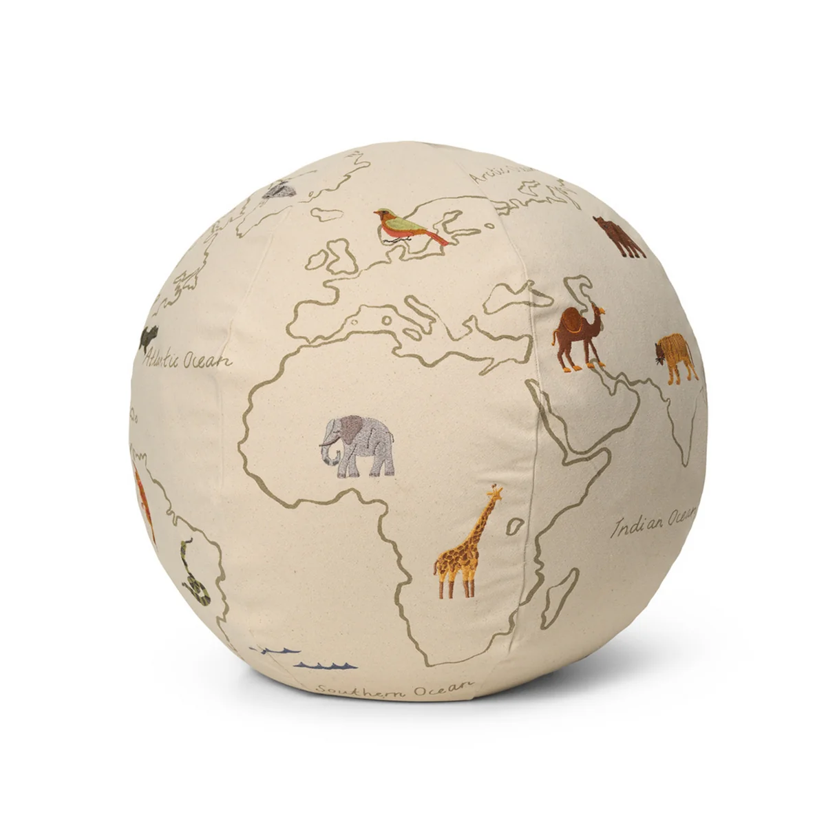 Der The World Pouf des Herstellers Ferm Living begeistert nicht nur mit seiner natürlichen Optik, sondern inspiriert zum Lernen über die Kontinente der Welt. The World ist eine spielerische Ergänzung für das Kinderzimmer. Die Umrisse der Kontinente sind mit niedlichen, bunten Tierfiguren verziert, welche auf den Stoff gestickt sind. Die Außenhülle des Poufs wird aus 100% GOTS-zertifizierter Bio-Baumwolle gefertigt. Die Füllung besteht aus Vlies-Schmelzpapier mit Thermobällen. Bei Bedarf mit einem feuchten Tuch abwischen.