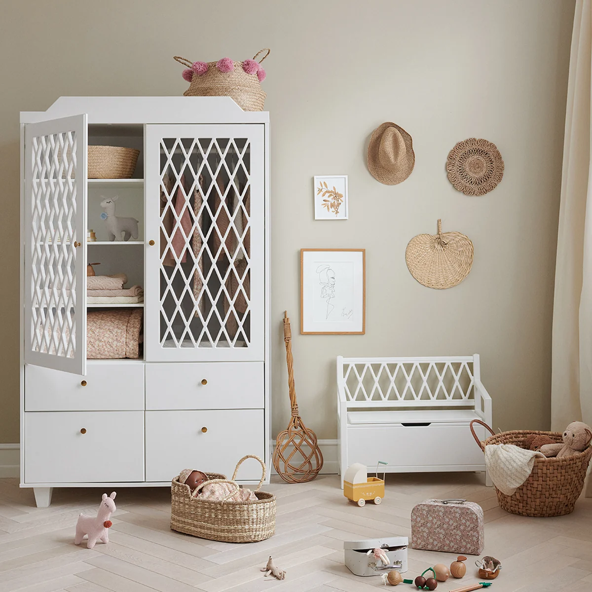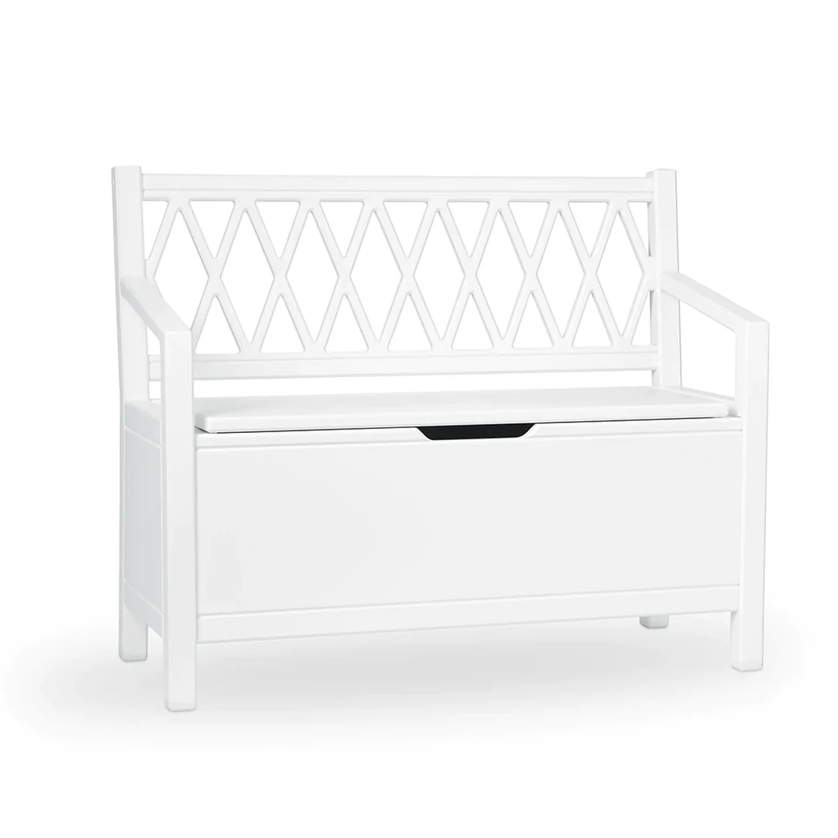 Die Harlequin Kinderbank mit Aufbewahrung von Cam Cam Copenhagen überzeugt durch das multifunktionale Design und die detailreich gestaltete Optik. Die Bank kann neben ihrer herkömmlichen Funktion auch zu Aufbewahrungszwecken verwendet werden. Der Sitz verfügt über einen ruhigen und langsamen Schließmechanismus, sodass die kleinen Finger nicht eingeklemmt werden. Die Bank ist stabil und robust und kann somit über lange Jahre verwendet werden. Die Harlequin Kinderbank wird aus 100% FSC-zertifiziertem MDF hergestellt.