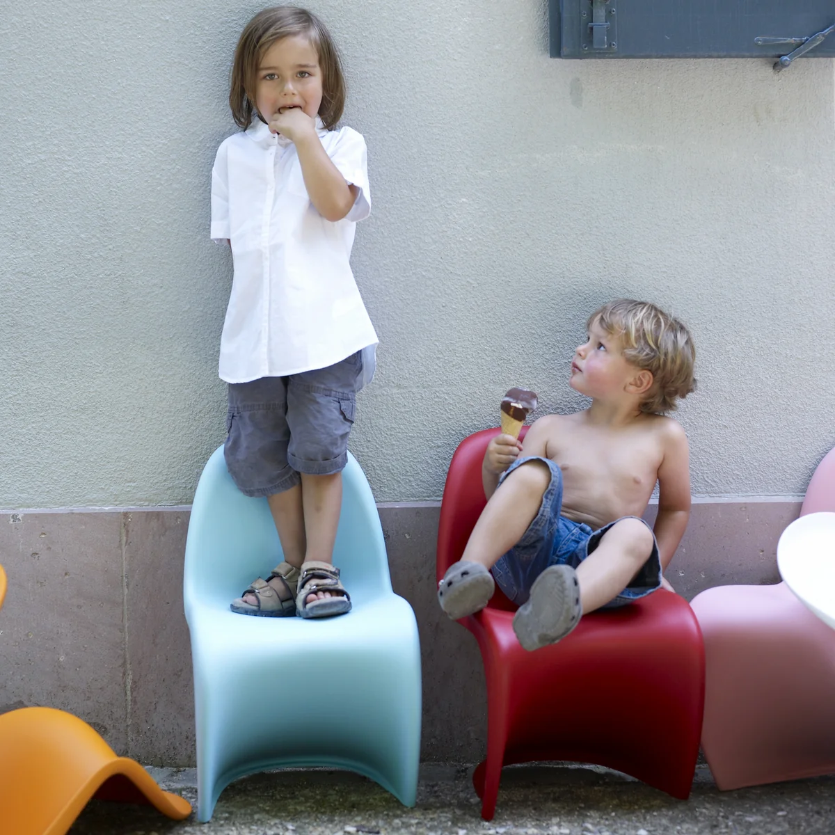 Der Panton Junior Kinderstuhl von Vitra ist eine kompakte Version des Originals, dem Panton Chair von Vitra. Kinder haben den Panton Chair wegen seiner fröhlichen, kräftigen Farben und wegen seiner angenehm sanften Rundungen schon immer besonders gemocht - als Sitzmöbel und als Spielzeug. Verner Panton selbst verfolgte daher bereits früh die Idee, gemeinsam mit Vitra eine Kinderversion des Stuhles zu realisieren. Dieses Vorhaben, das vor mehr als 35 Jahren aus ökonomischen Gründen scheiterte, konnte jetzt verwirklicht werden: Auf der Grundlage von Pantons ursprünglichen Plänen entstand der Panton Junior.