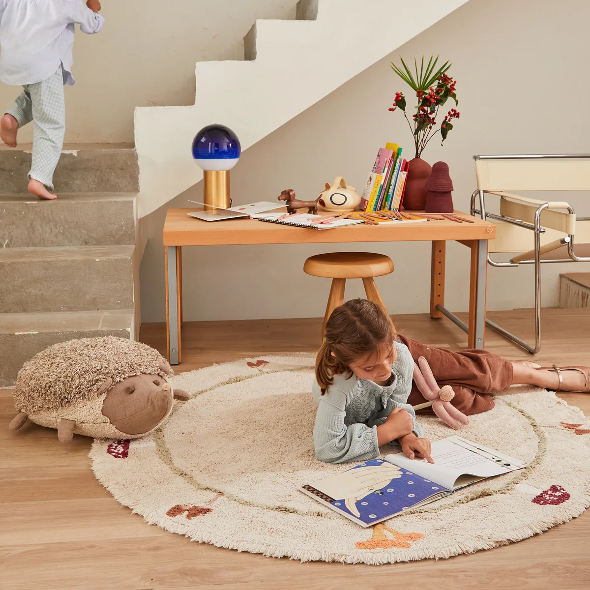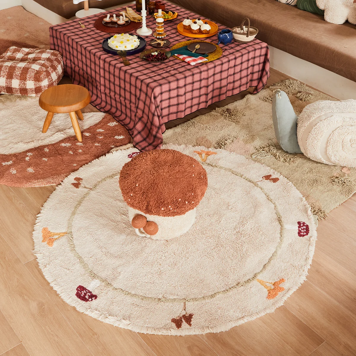 Lorena Canals - Chanterelle Teppich, Ø 140 cm, natur / olive / honey / burgundy