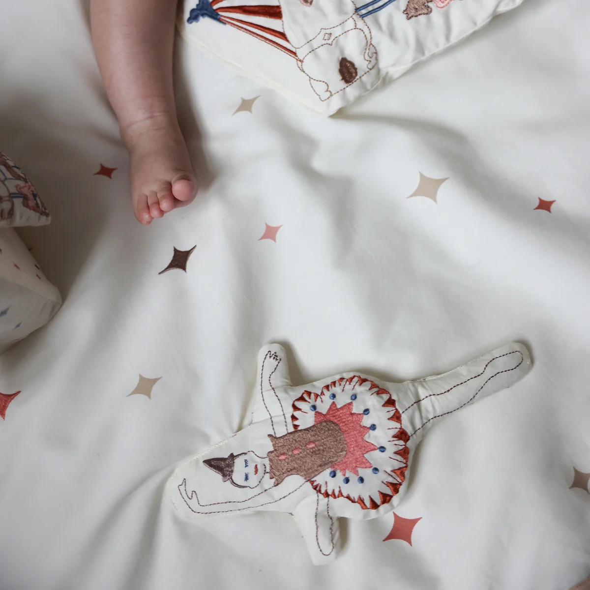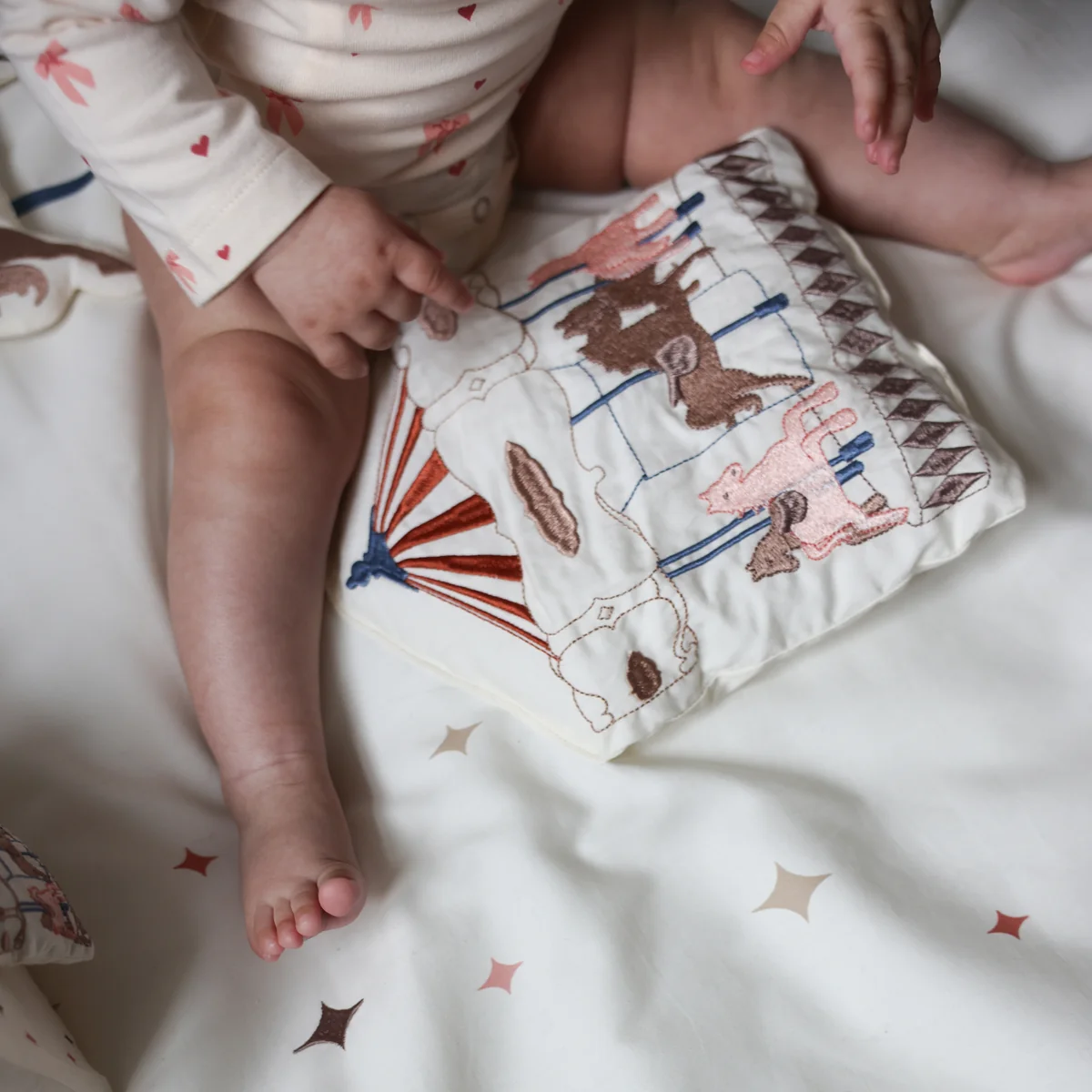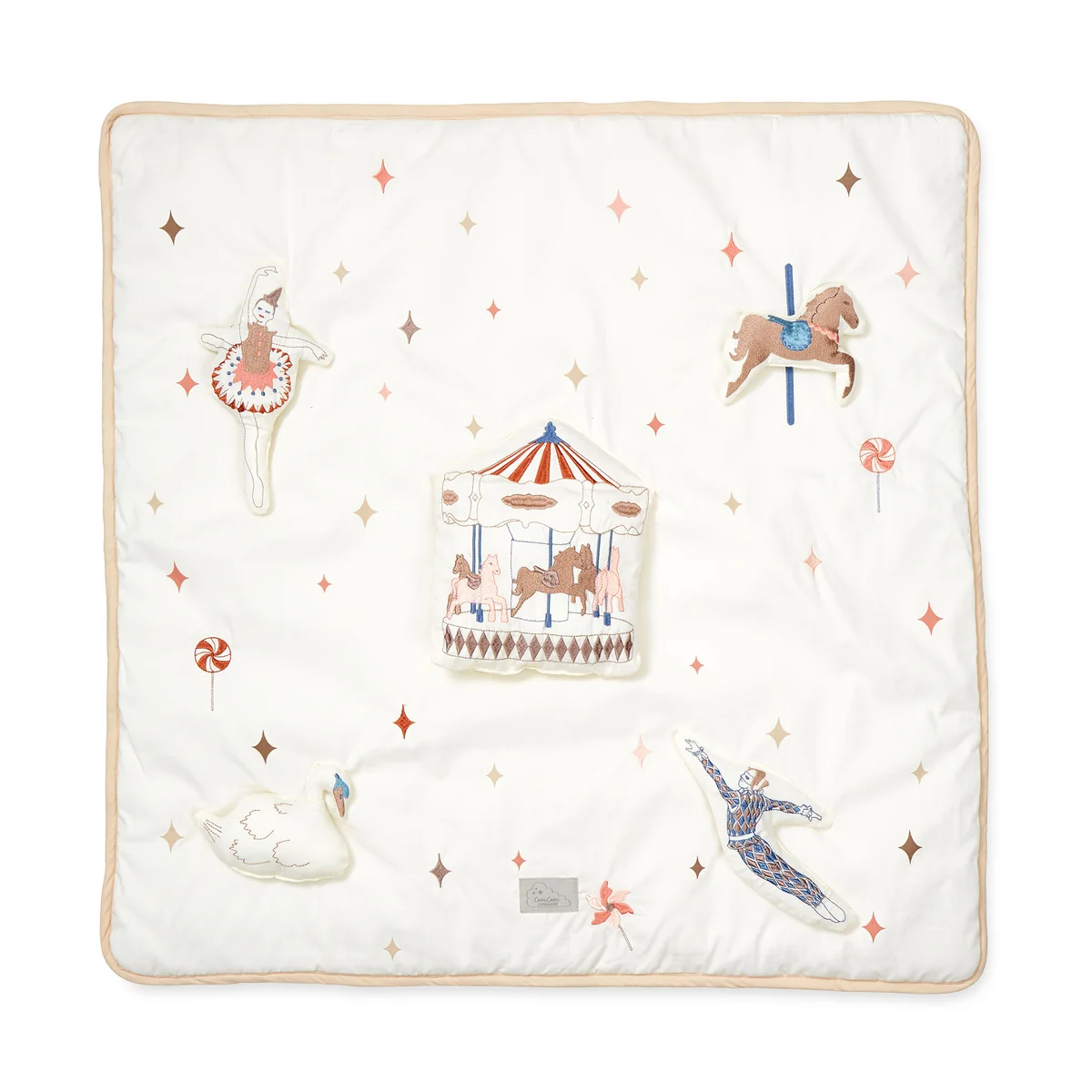 Die integrierten Spielzeuge und Texturen regen die Sinne an, während das Baby auf der weichen Matte liegt oder spielt. Das verspielte Design, kombiniert mit liebevoll gestalteten Details, schafft eine anregende Umgebung, die die Entwicklung der motorischen Fähigkeiten und der visuellen Wahrnehmung fördert.