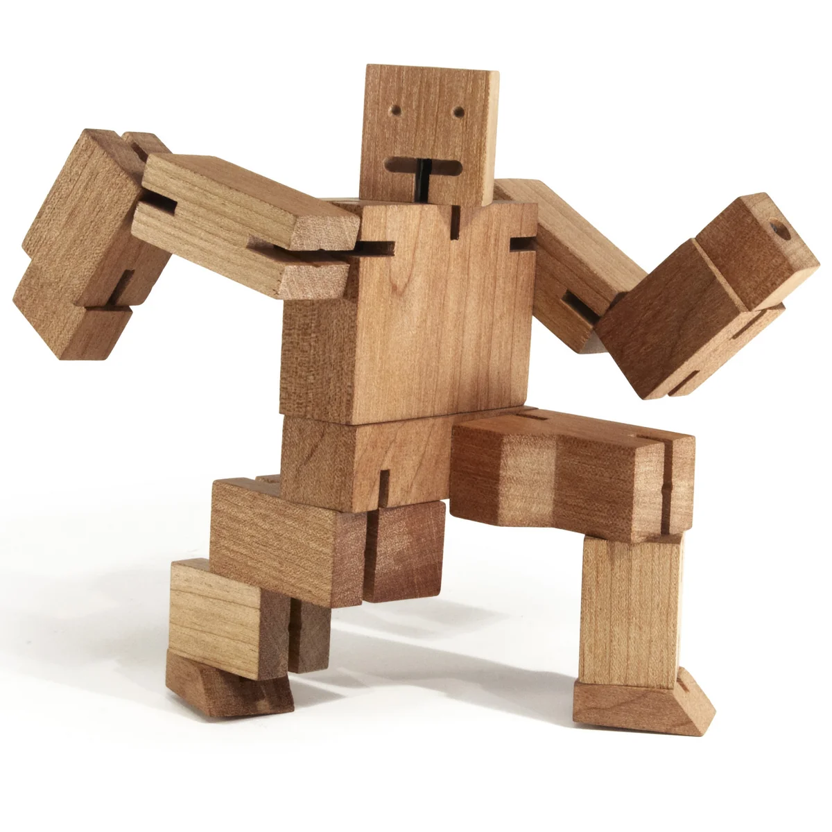 Heldenhaft posieren, laufen, tanzen, knien oder einfach nur stehen - Der Cubebot kann zahlreiche Posen einnehmen. Die Gelenke und Muskeln werden dabei durch Gummibänder flexibel zusammengehalten. Und wie es sich für einen richtigen Roboter gehört ist auch der Cubebot beinahe unzerstörbar: Das Holz-Modell ist hart und stabil und daher gegen fast jeden Schlag und Fall gerüstet.