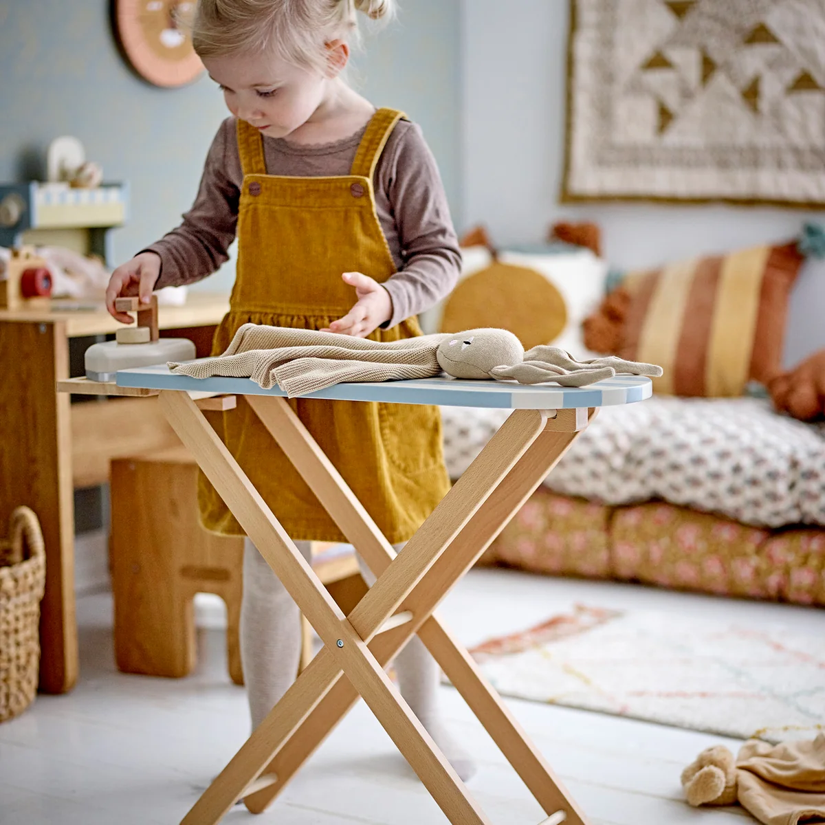 Das Mini Sande Spielzeug Bügelbrett mit Bügeleisen von Bloomingville ist das ideale Accessoire für kleine Hausmeisterinnen und Hausmeister. Hergestellt aus hochwertigem Kiefernholz, bietet dieses Bügelbrett nicht nur stundenlangen Spielspaß, sondern ist auch robust und langlebig.