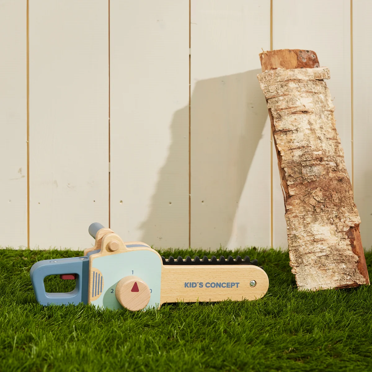 Die Kid's Hub Motorsäge von Kids Concept aus Holz ist mit einem Druckknopf und einem seitlichen Drehknopf ausgestattet, begleitet von einem authentischen Klickgeräusch. Mit ihrem realistischen Design und ihrer einfachen Handhabung bringt sie den Spaß an Heimwerkerarbeiten in die Welt der Kinder.