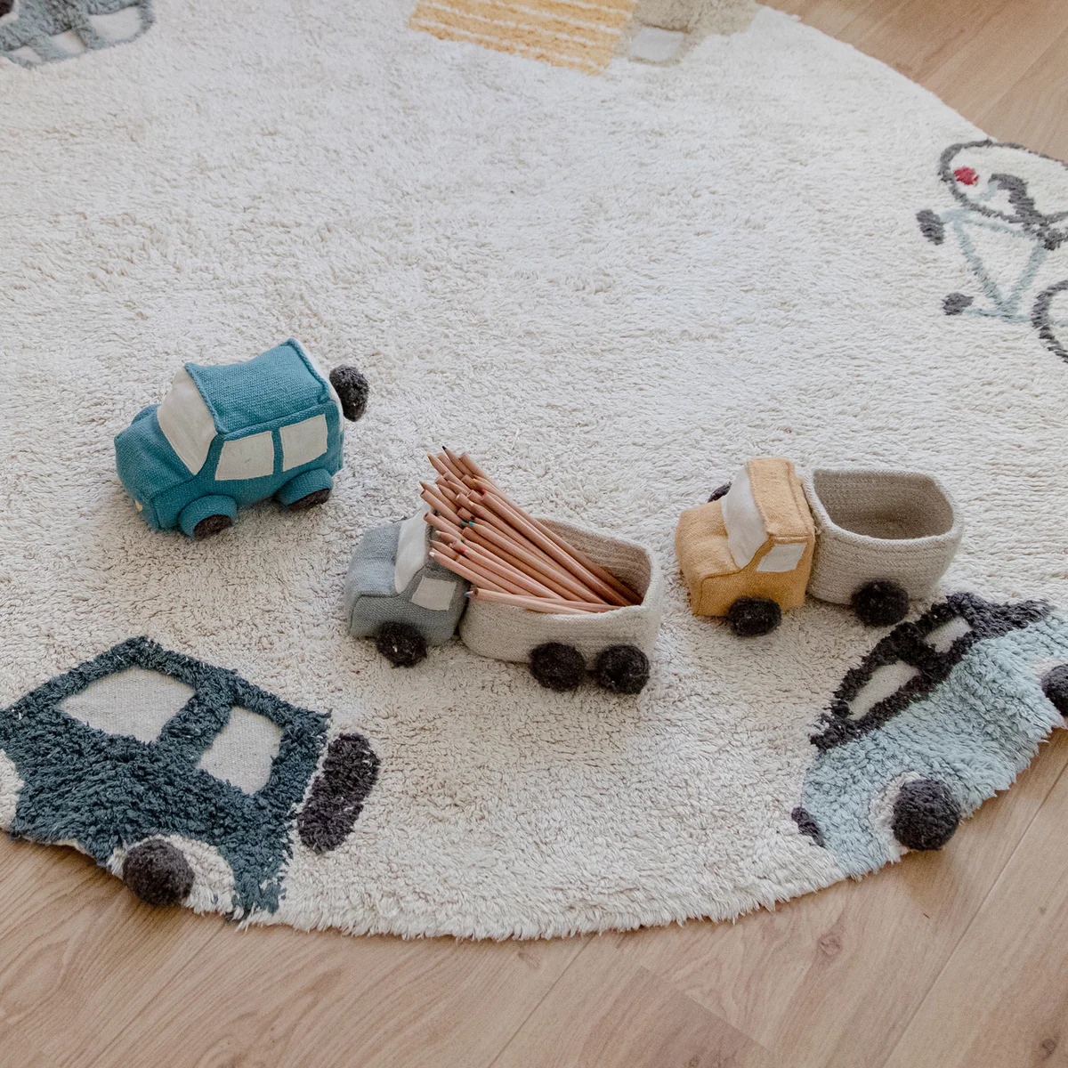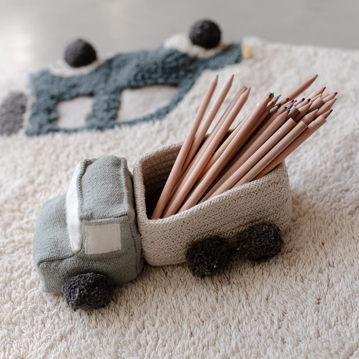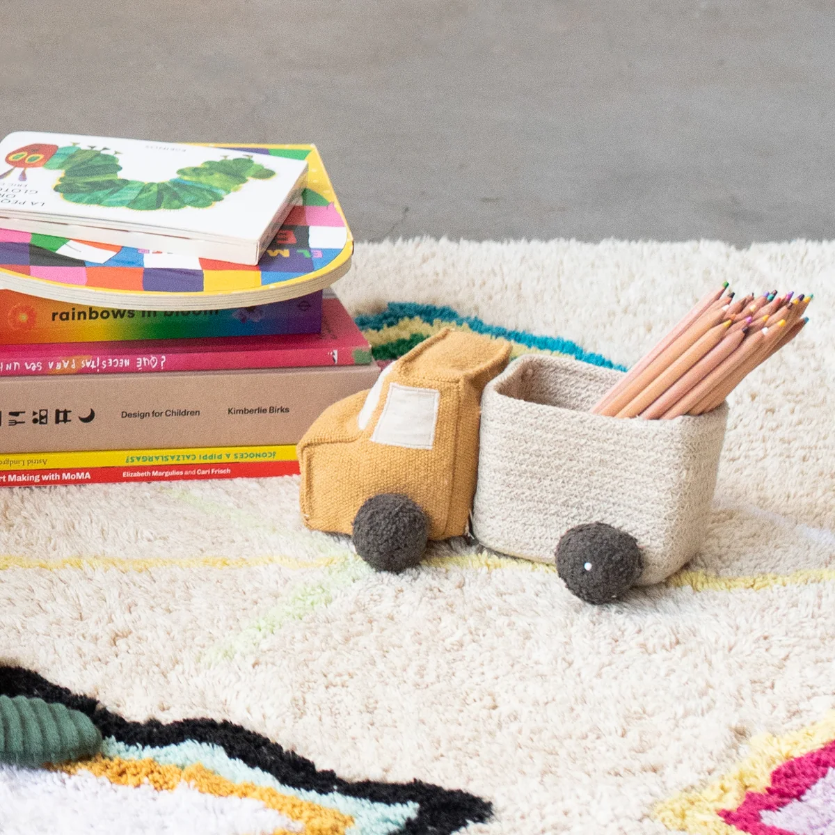 Der Spielzeug LKW aus dem Hause Lorena Canals bietet in seinen Pick-up-Körben idealen Platz für kleine Spielzeuge. Murmeln, Perle, Buntstifte und Co können ideal zum Verstauen und Transportieren genutzt werden. Die niedlichen Pompoms stellen die Räder des Pick-up-Trucks dar. Das Nummernschild des LKWs sorgt mit seiner Aufschrift "L0 R3 NA" für einen raffinierten Touch. Der Spielzeug LKW wird aus Baumwolle und Polyester gefertigt und ist im 2er-Set erhältlich. So macht das Aufräumen direkt mehr Spaß!