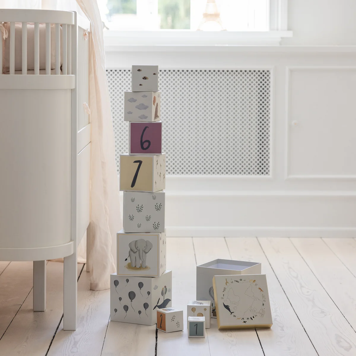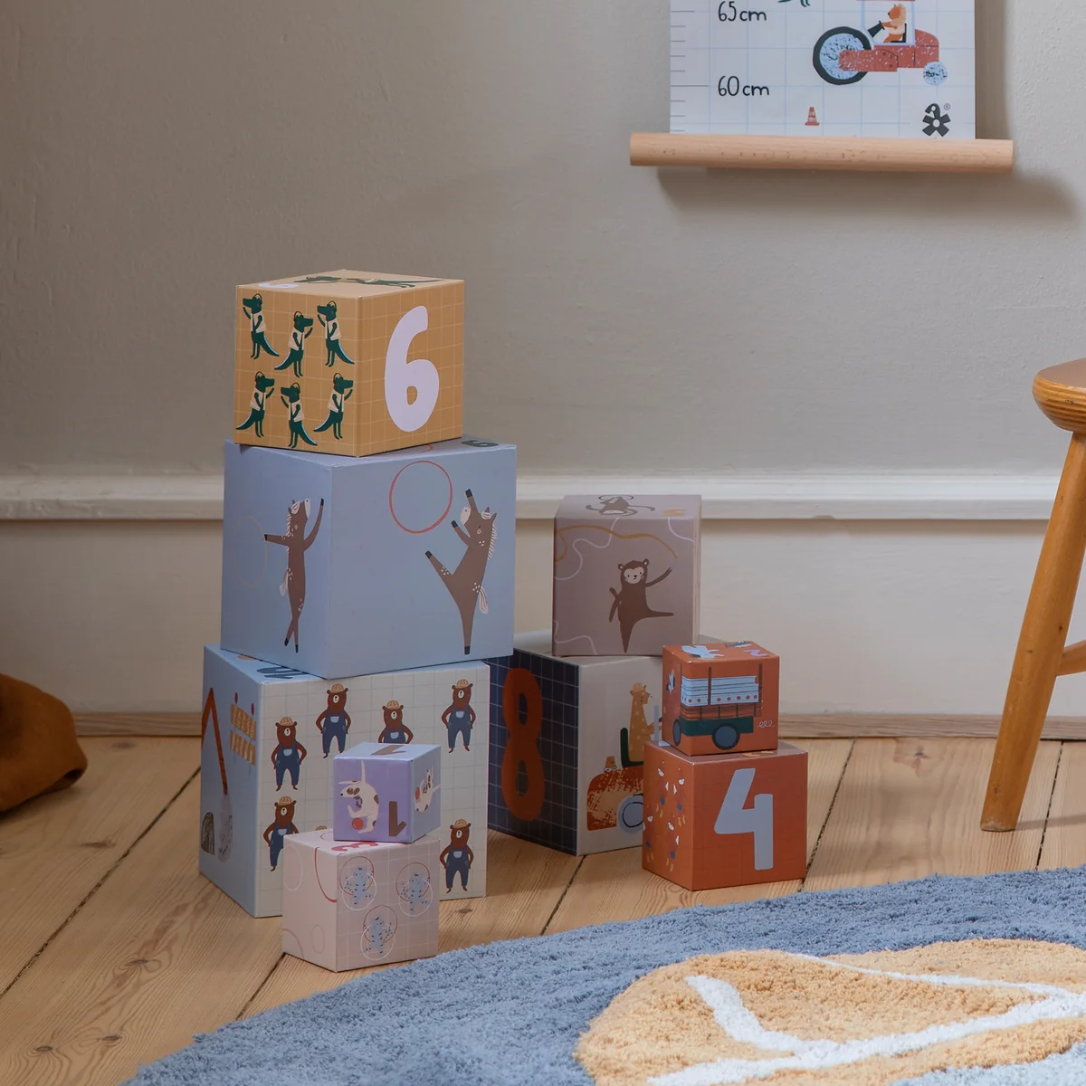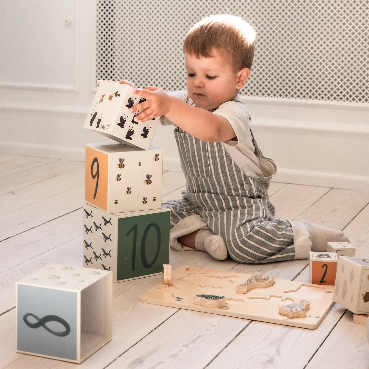 Auf den Blöcken aus festem Karton sind die Zahlen 1 bis 10 abgebildet. Damit lernen Kinder auf spielerische Weise die Zahlen kennen und bekommen ein Gefühl für „kleiner“ und „größer“, denn der größte Block hat die Zahl 10 und der kleinste die Zahl 1.