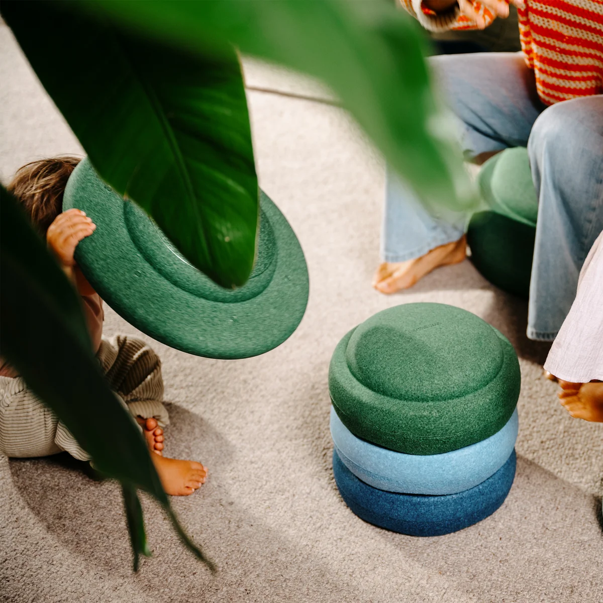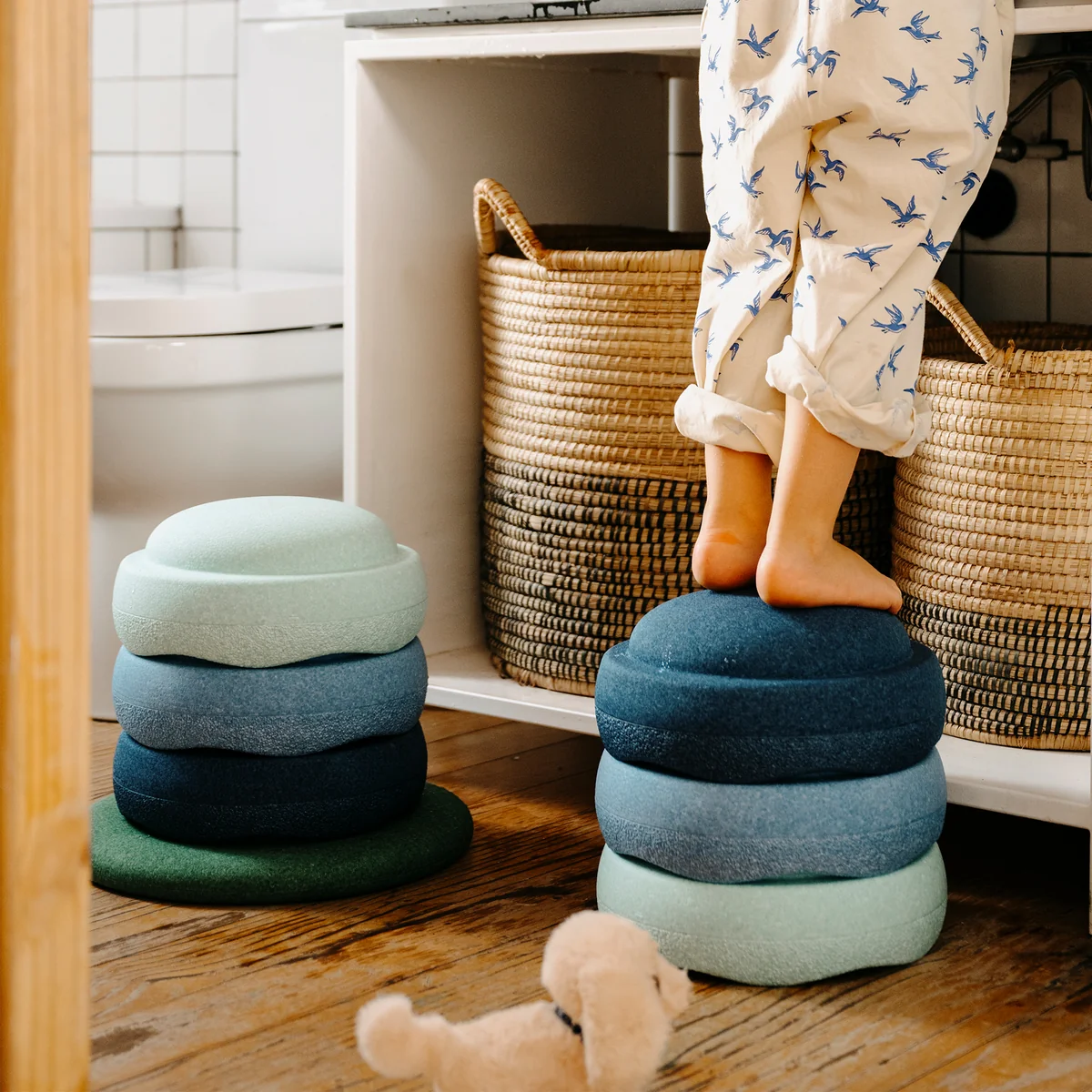 Das Stapelstein® Waters & Greens Set ist wunderbar für dynamisches Sitzen oder aktive Balance-Übungen geeignet. Die Sitzhöhe des bunten Steins kann ganz individuell angepasst werden. Werden die Stapelsteine aufeinander gestapelt, steigert sich automatisch der Schwierigkeitsgrad.
