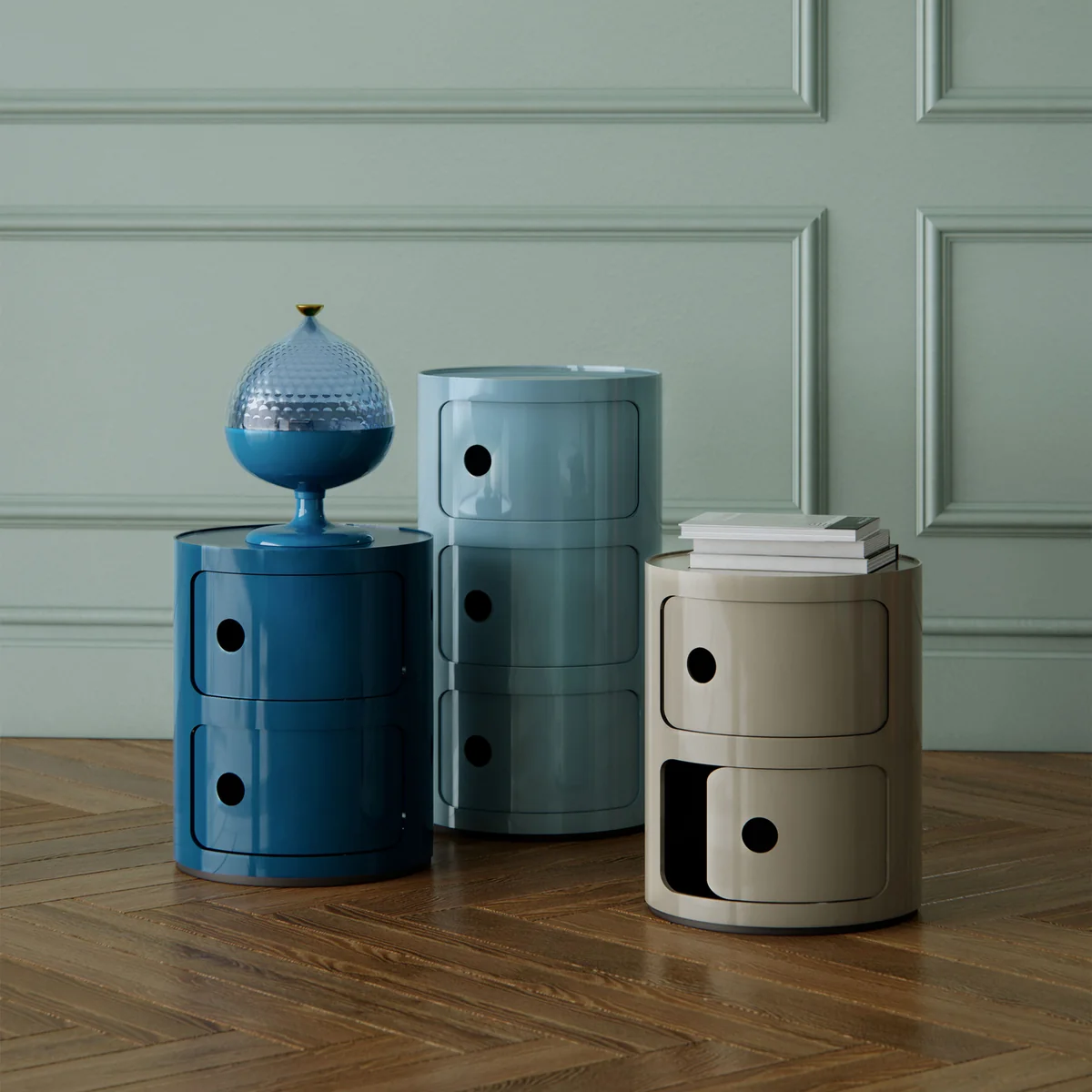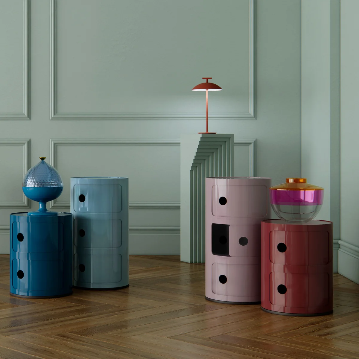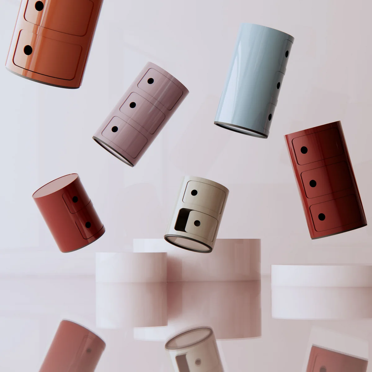 Die Baukastenelemente Componibili wurden 1969 von Anna Castelli Ferrieri entwickelt, um verschiedenste Verwendungsanforderungen zu erfüllen. Die Container von Kartell können in allen Bereichen des Hauses Platz finden: im Bad, im Schlafzimmer, in der Küche und im Wohnzimmer ebenso wie im Kinderzimmer.
