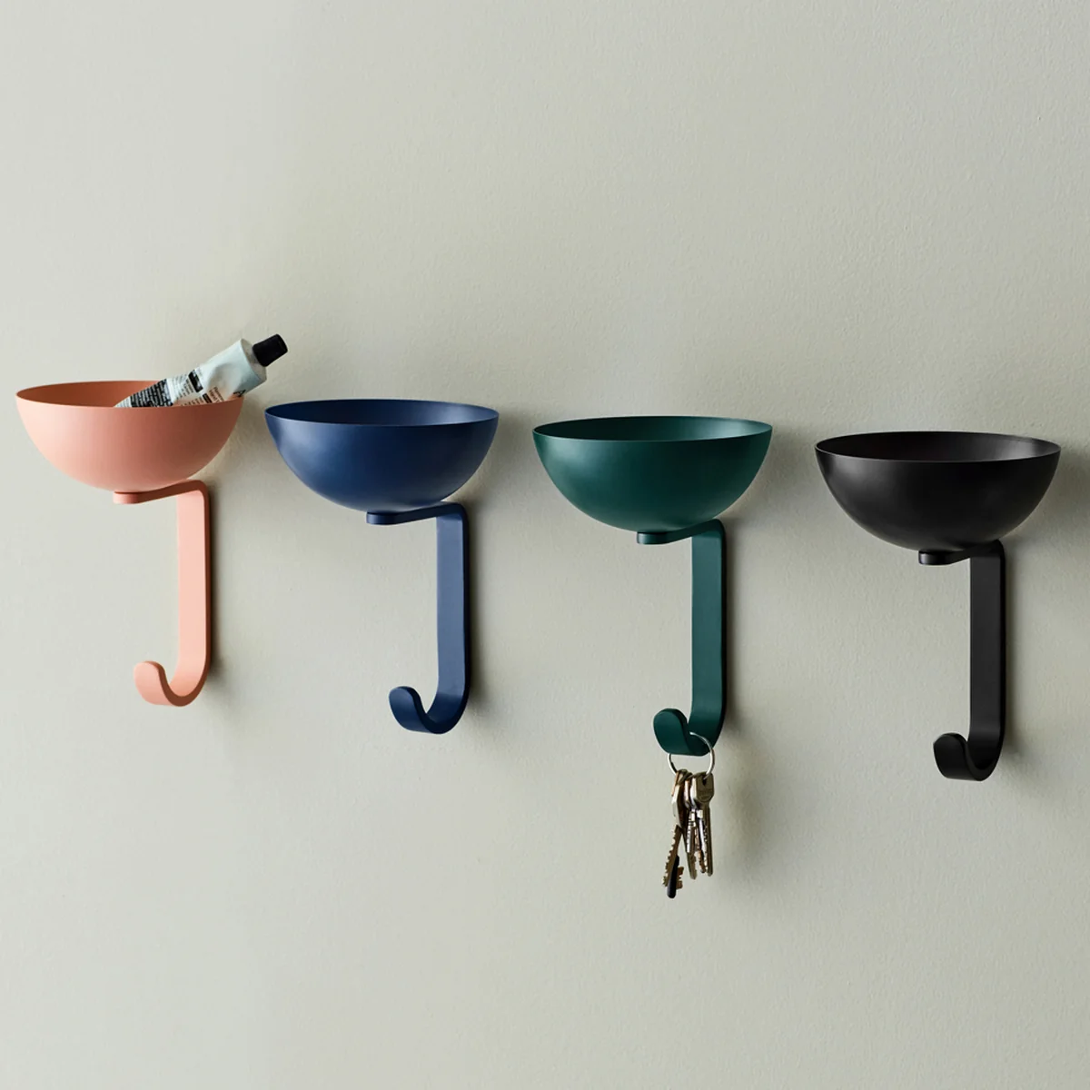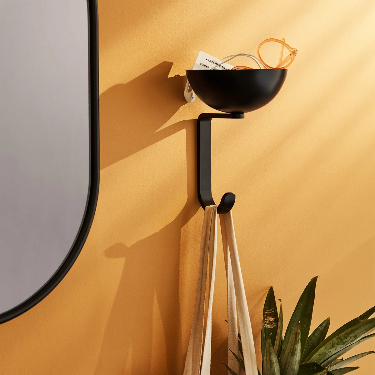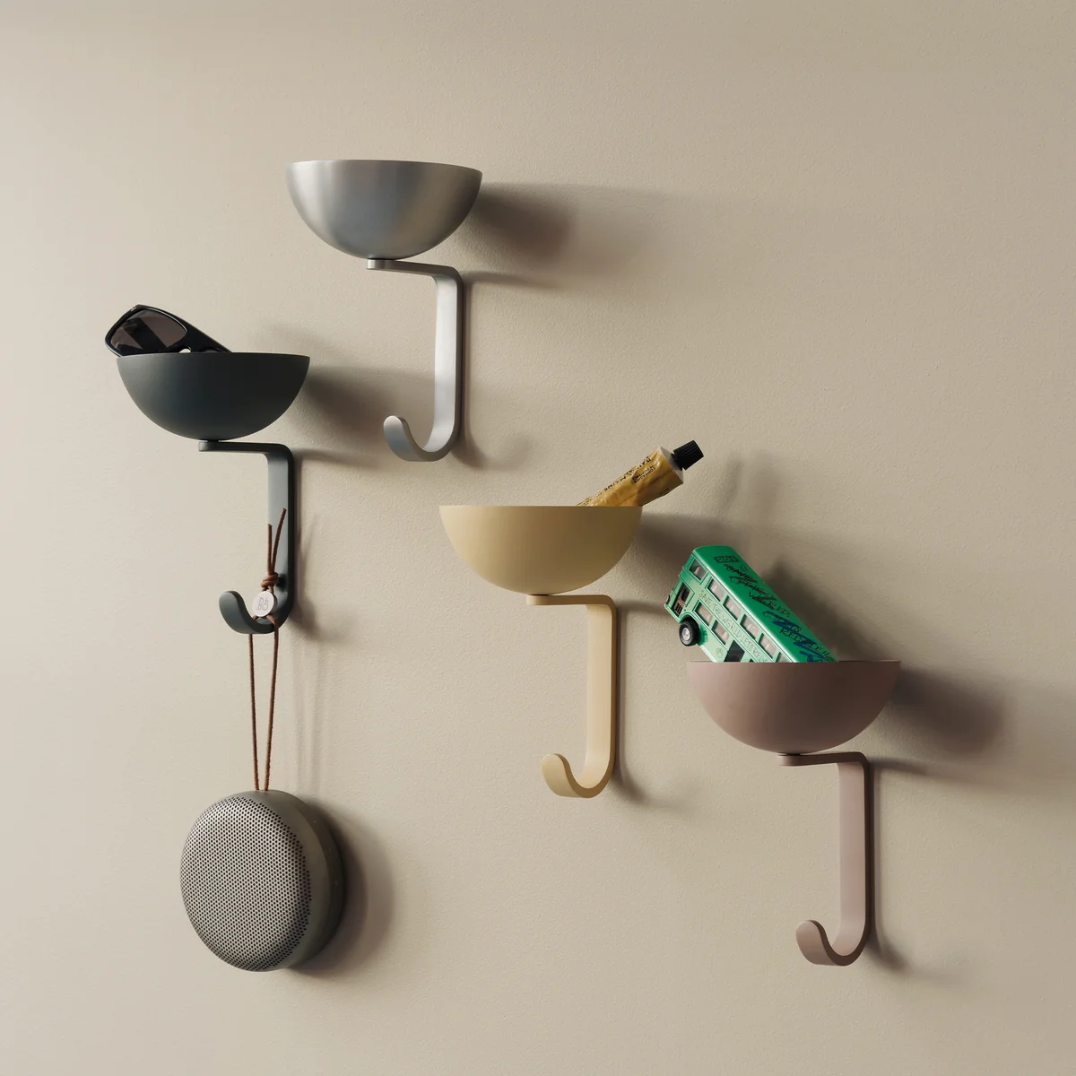 Der Wandhaken aus Stahl und Aluminium ist mit einem runden Schälchen - ähnlich einem Vogelnest - kombiniert, das Gegenstände alle Art sicher verwahrt.