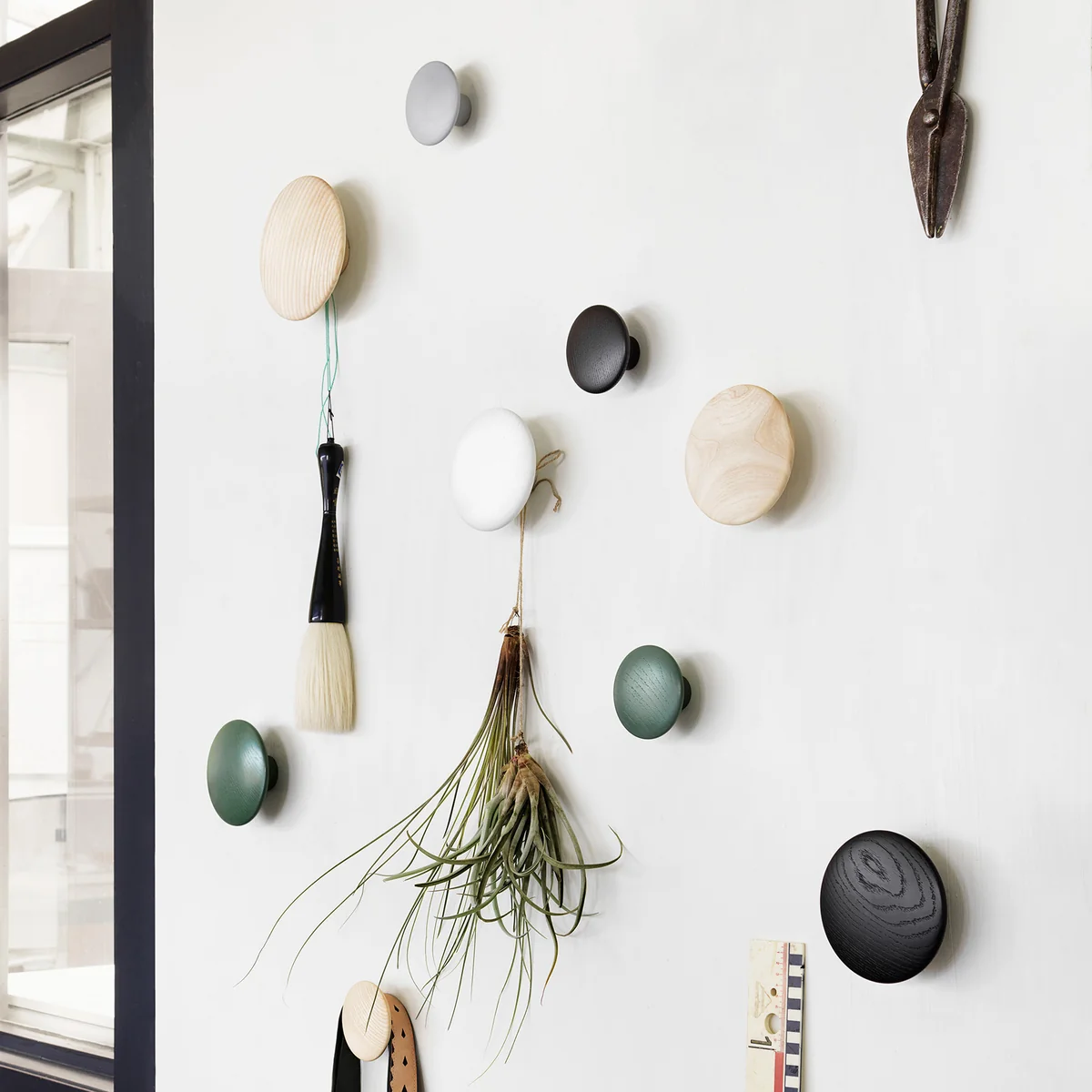 Die weich abgerundeten Holzobjekte werden mit dem runden Hals direkt an der Wand platziert, ein Herunterrutschen vom Knopf ist aufgrund des breiten Kopfs ausgeschlossen. Somit garantieren die Dots von Muuto, jederzeit sicheren und stilvollen Halt für ihre Kleidung, Taschen und Accessoires.