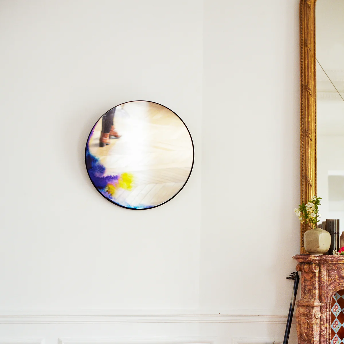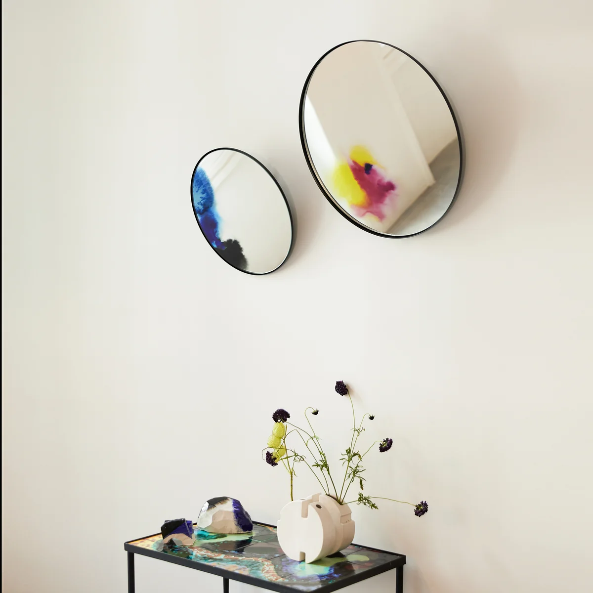 Die verschiebenden Farben an der Seite des Spiegels erinnern an die Oxidation von antiken Spiegeln oder Farbtönen einer Make-up-Palette. Die lebendigen und tiefen Farben werden auf die Oberfläche jedes Spiegels durch Digitaldruck eingefügt. Die Rückseite des Spiegels ist leicht konvex, weshalb der Spiegel ein wenig nach vorne fällt und so an venezianische Spiegel erinnert. Der kreisrunde Spiegel wird von pulverbeschichtetem Aluminium umrandet.