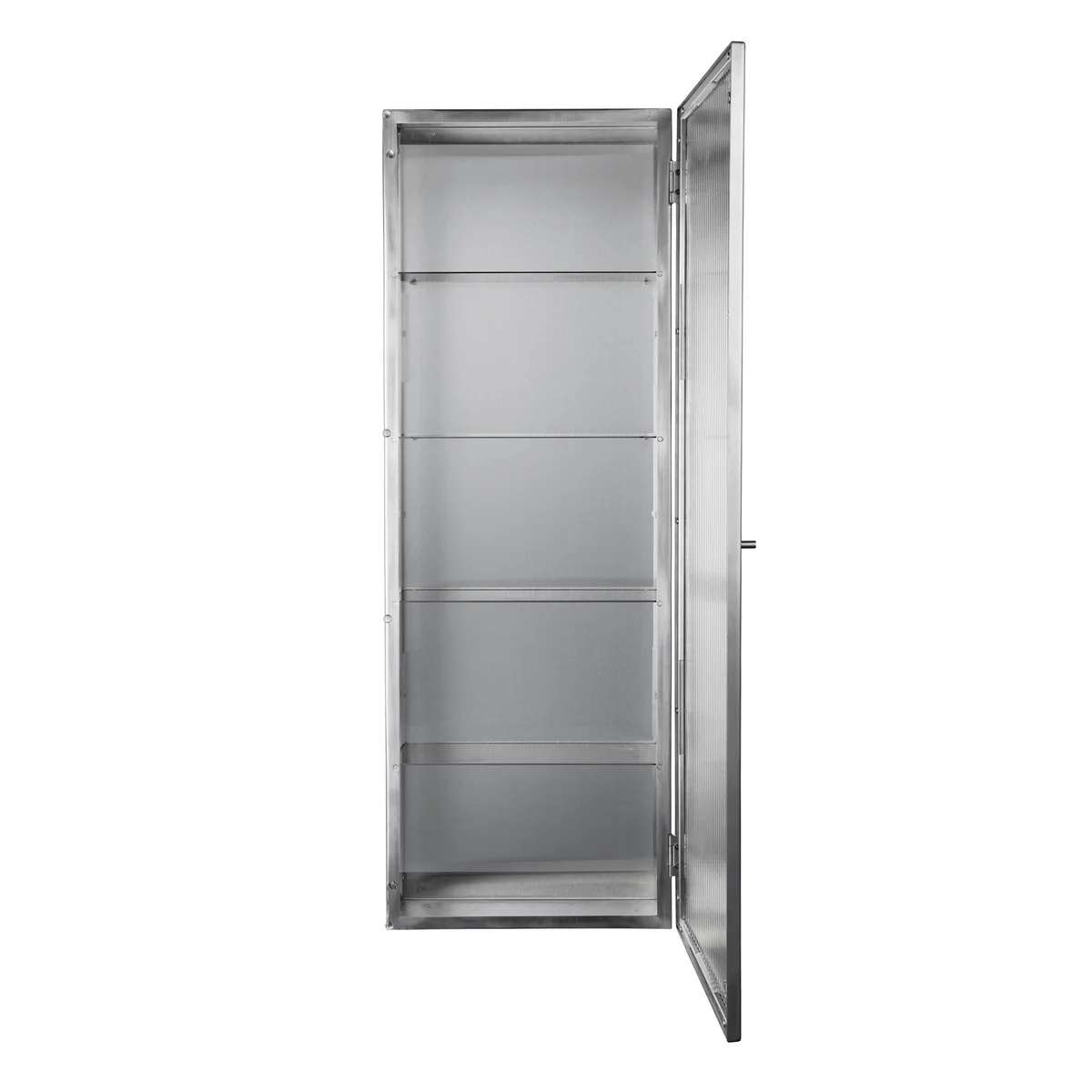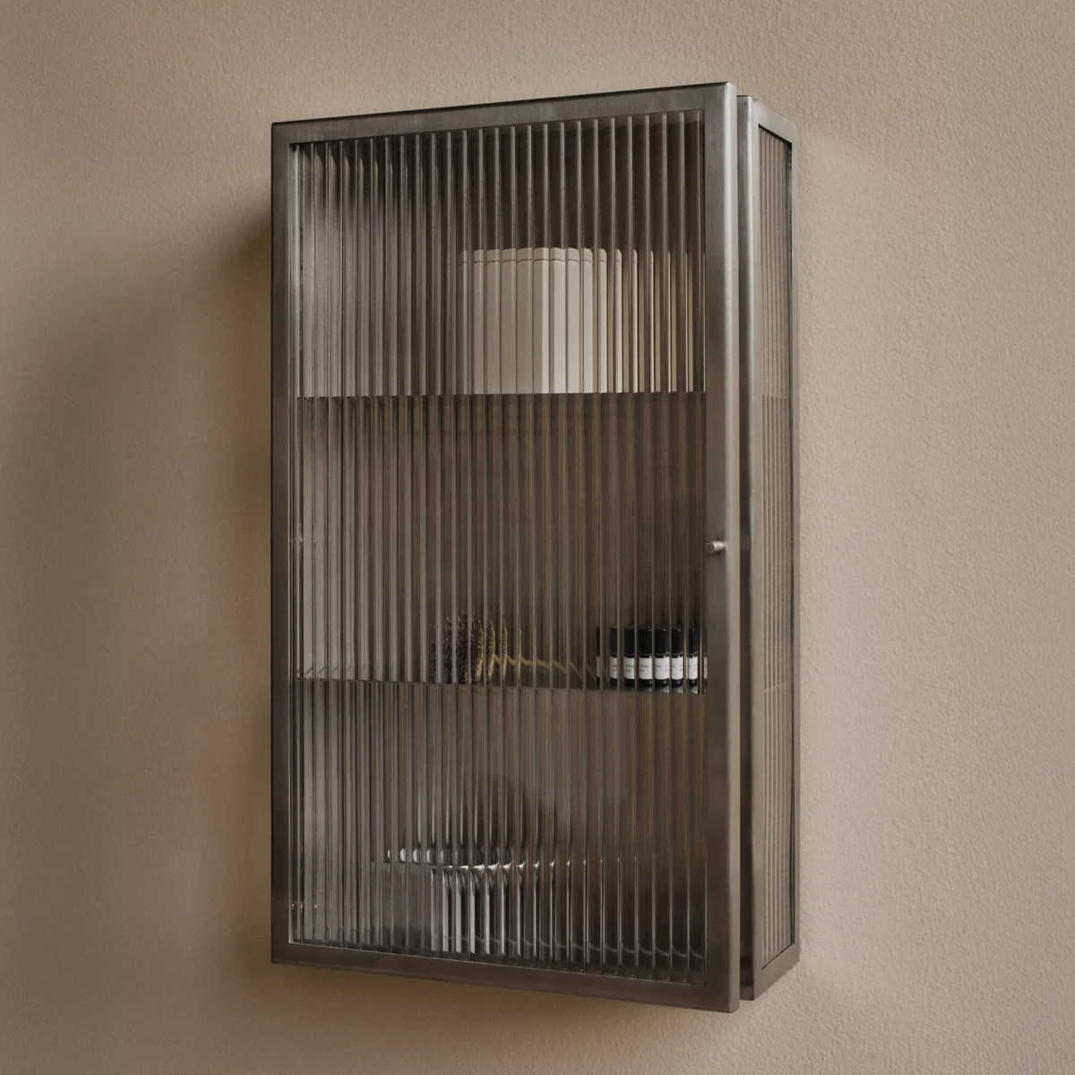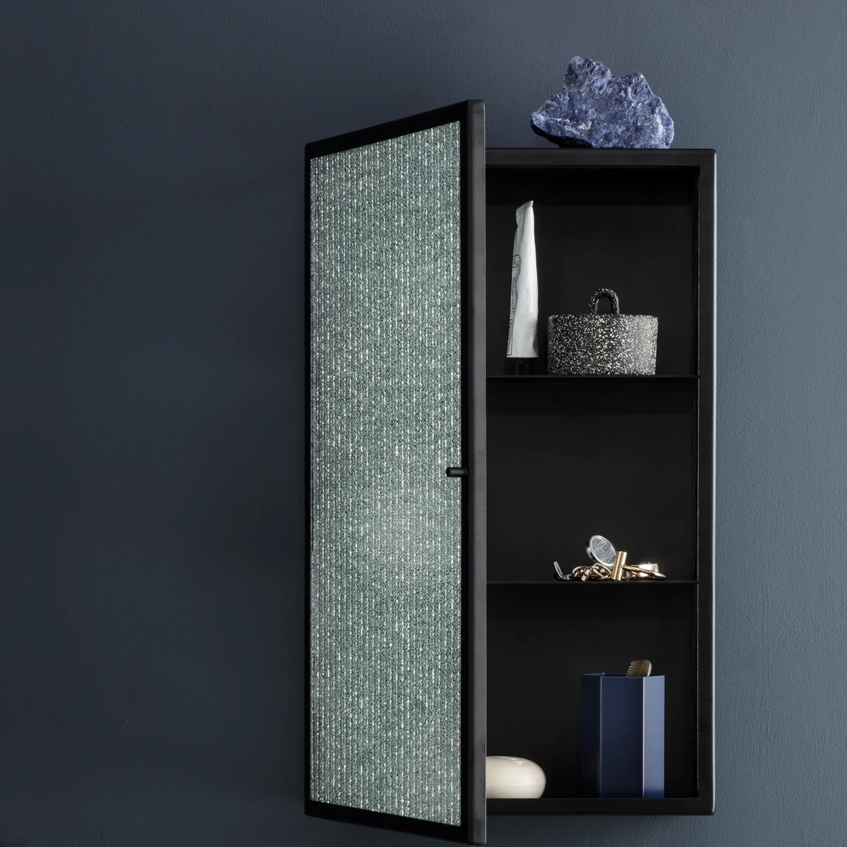 Das Zusammenspiel aus Drahtglas und Metall fügt sich markant in jede Einrichtung ein und wirkt aufgrund des halbdurchsichtigen Glases dennoch leicht. Der Wandschrank mit seinem industriellen Charakter passt sowohl ins Badezimmer als auch in die Küche oder das Esszimmer. So finden Kosmetika und Handtücher aber auch Gewürze, Geschirr und Gläser einen stilvollen Platz.