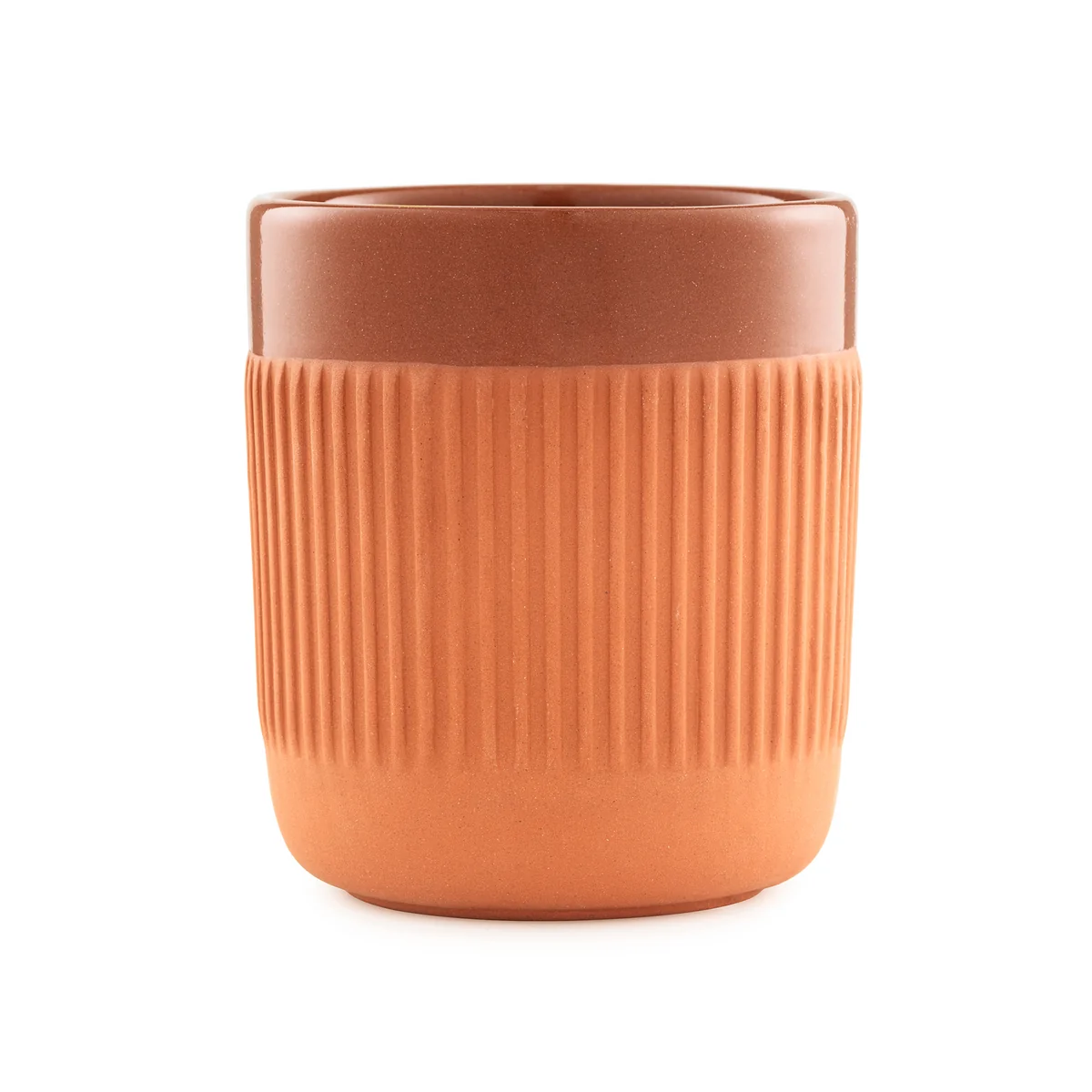 Entworfen von Simon Legald ist die Formgebung des Bechers straff und dabei doch sanft, mit einer freundlichen, handgearbeiteten Optik, die von der rustikal gebrannten Terrakotta hervorgehoben wird. Diese Farbtöne bringen einen Hauch von mediterraner Wärme auf den Esstisch.