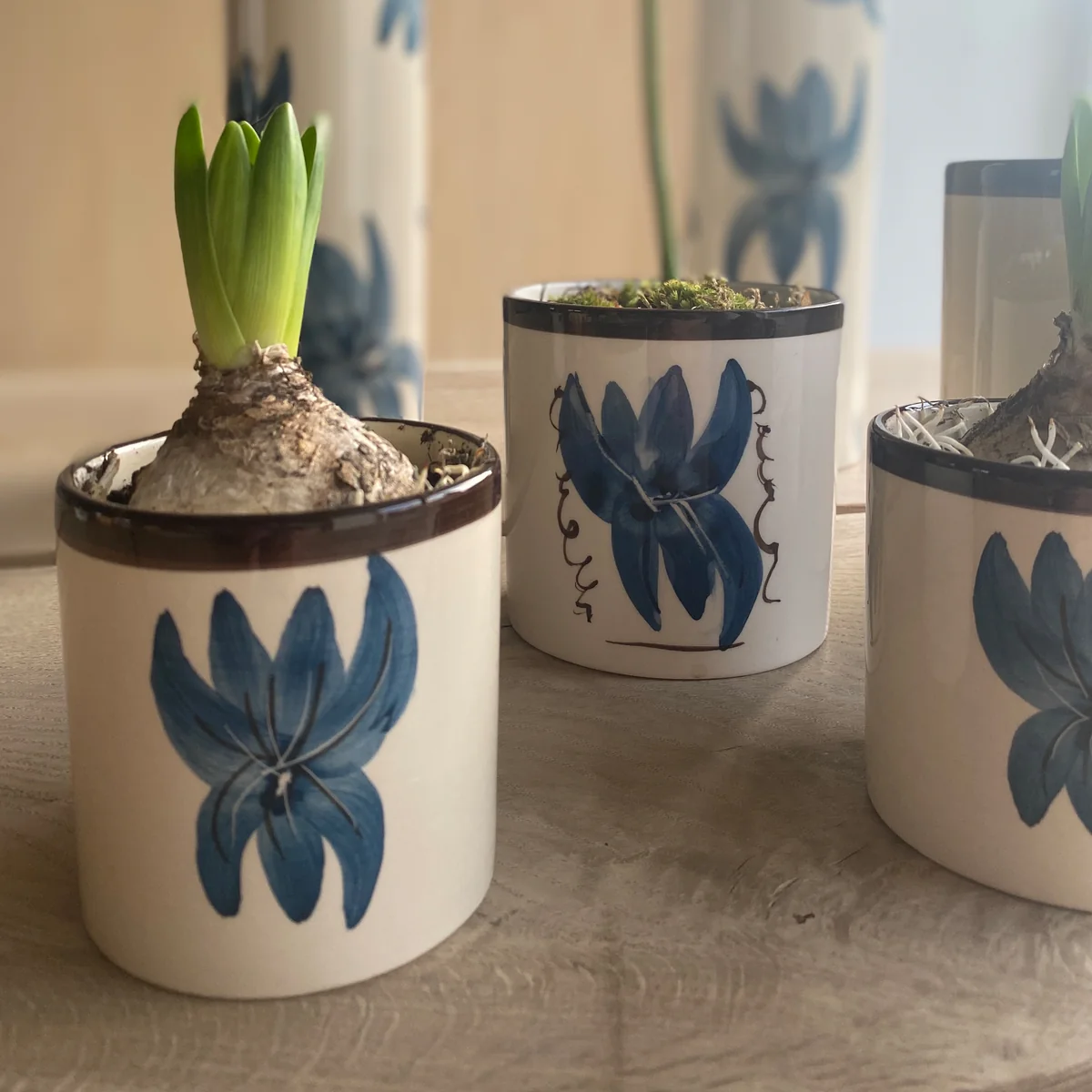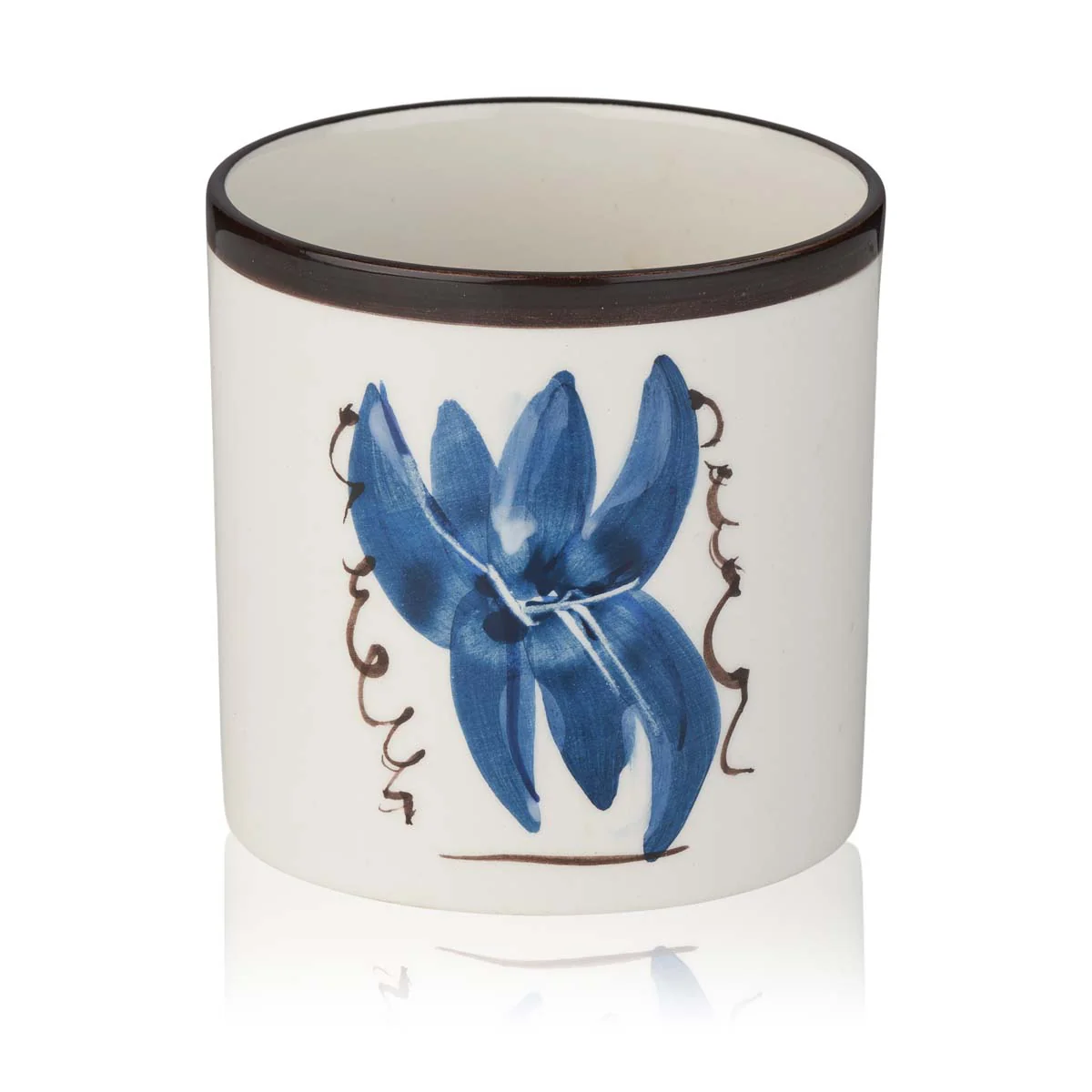 Keramik Vase von Humdakin an. Der Behälter ist in verschiedenen Größen erhältlich und ist z.B als Stiftbecher gut zu verwenden. Am oberen Ende ist ein dunkler Rand auf den Behälter aufgemalt. Das blaue Blumenmuster, das minimalistisch auf den Behälter aufgetragen ist, verbindet Klassisches mit Modernem - aber immer auf harmonische Art und Weise.