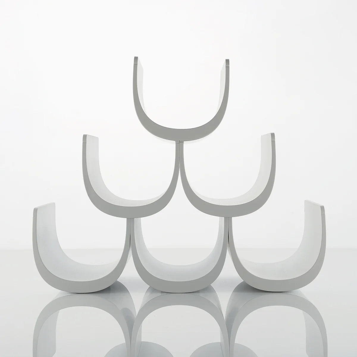 Ein besonderes Detail des Noè Flaschenhalters von Alessi ist seine modulare Verwendbarkeit. Jedes Modul kann eine Flasche aufnehmen und lässt sich mithilfe einer im Boden verlaufenden Nut leicht in zwei weitere einspannen. Durch die Kombination und das Übereinandersetzen mehrerer Noè-Elemente lassen sich Strukturen schaffen, die genauso viel Wein aufnehmen wie gewünscht.
