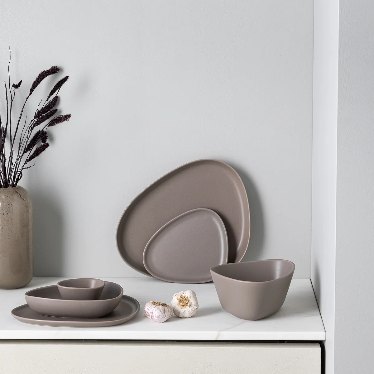 Die Teller sind in verschiedenen Größen erhältlich und somit für jede Art von Speisen geeignet. Der tiefe Teller eignet sich für Suppen, die flachen Teller für Frühstück, Mittag- und Abendessen gleichermaßen und die Platte ist optimal zum Servieren und Anrichten geeignet. Hergestellt werden die Teller aus robustem Steinzeug, wodurch sie einfach in der Spülmaschine gereinigt werden können.