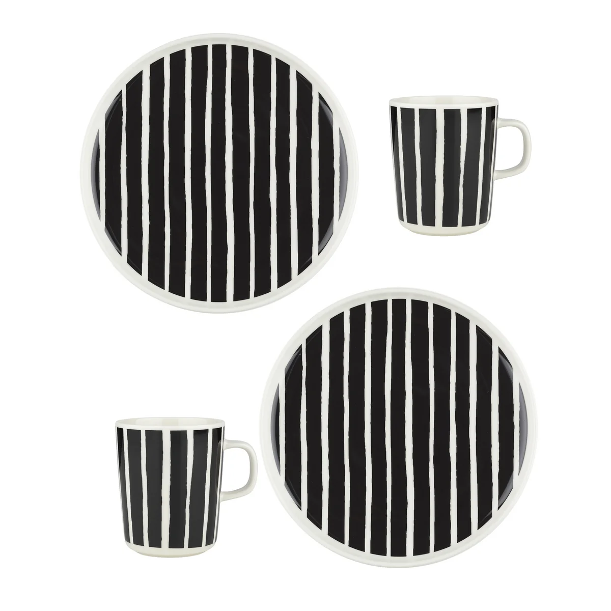 Marimekko - Oiva Piccolo Becher mit Henkel & Teller, weiß / schwarz (4er-Set)
