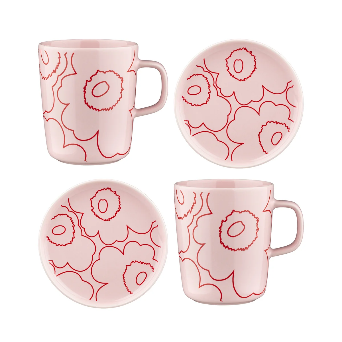 Das Piirto Unikko Oiva Geschirr-Set umfasst zwei Tassen (2,5 dl) und zwei Teller (13,5 cm), gefertigt aus hochwertiger Keramik mit rosa Glasur. Das Set ist praktisch und vielseitig, da es spülmaschinen-, ofen-, mikrowellen- und gefriergeeignet ist. Verpackt wird es in einer eleganten Marimekko-Geschenkbox, ideal als stilvolles Präsent.