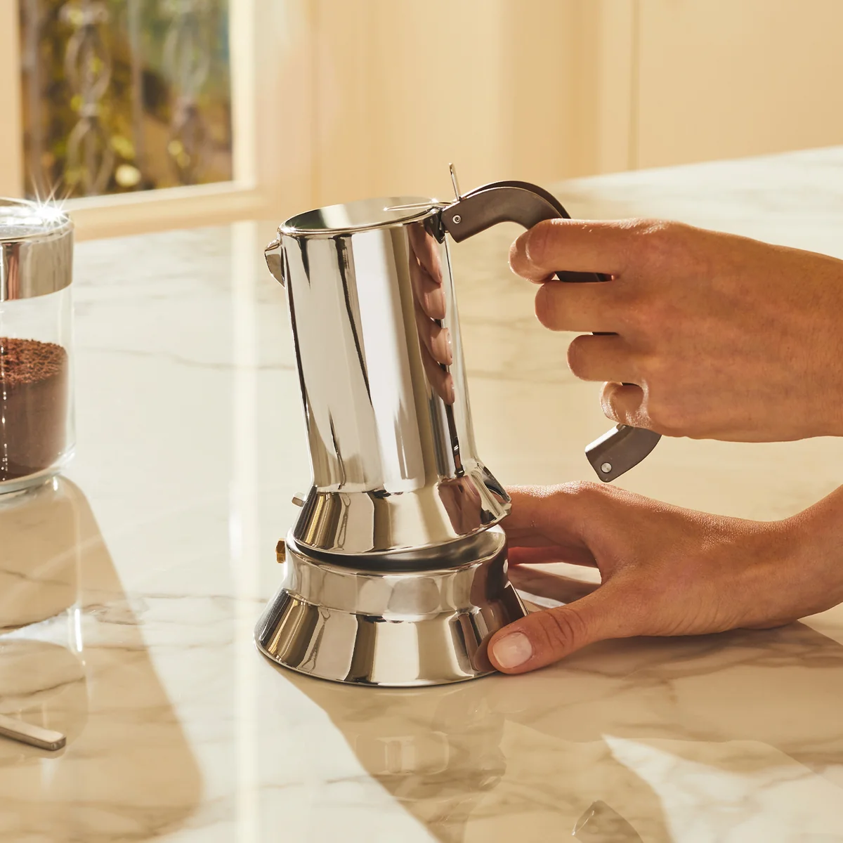 Die Espressomaschine besteht aus 18/10 Edelstahl und besitzt einen Magnetboden. Ihr Griff besteht aus Aluminiumguss. Die Espressomaschine 9090 ist nicht nur ein praktisches Küchengerät, sondern kann aufgrund des hochwertigen Designs auch direkt auf der Kaffeetafel Platz finden.