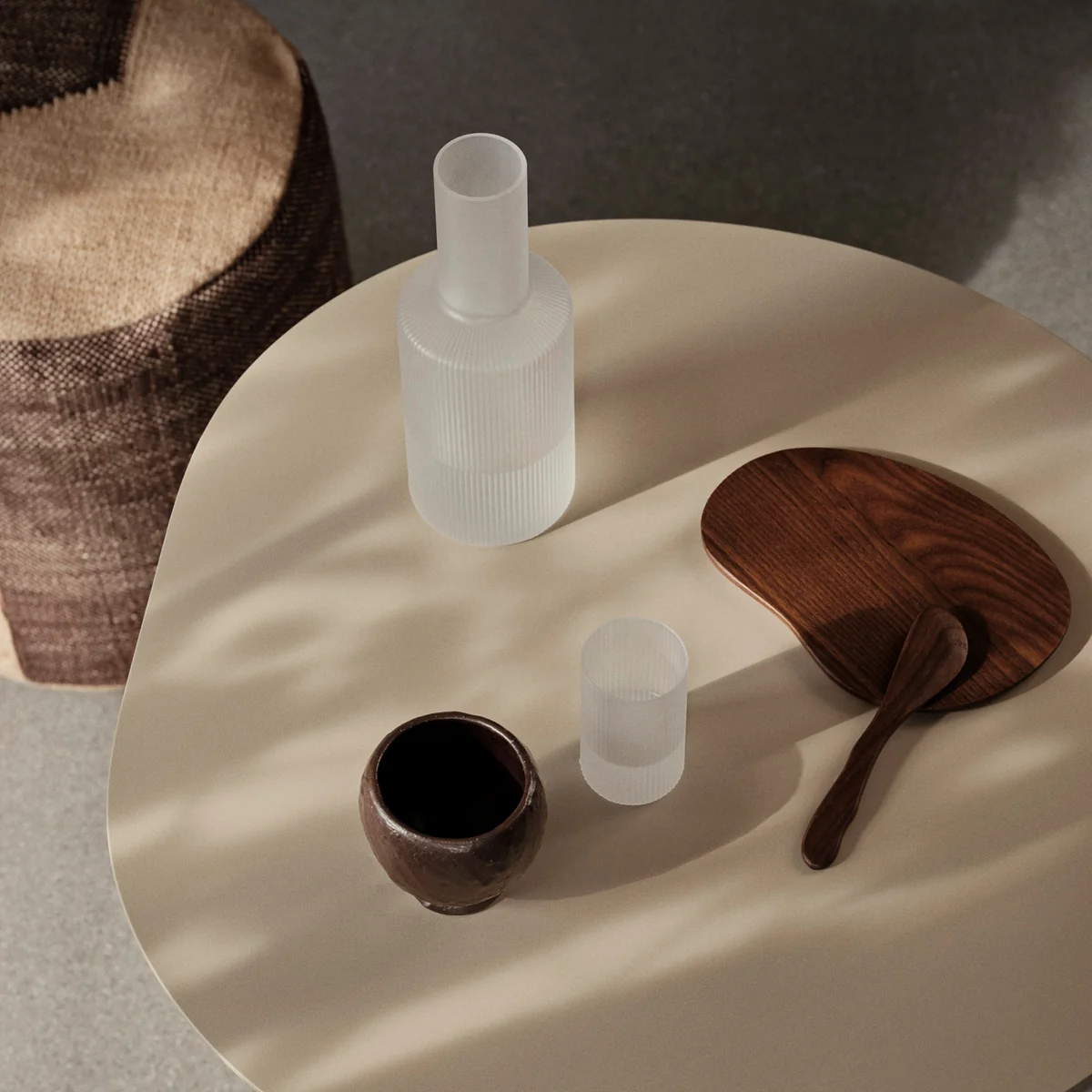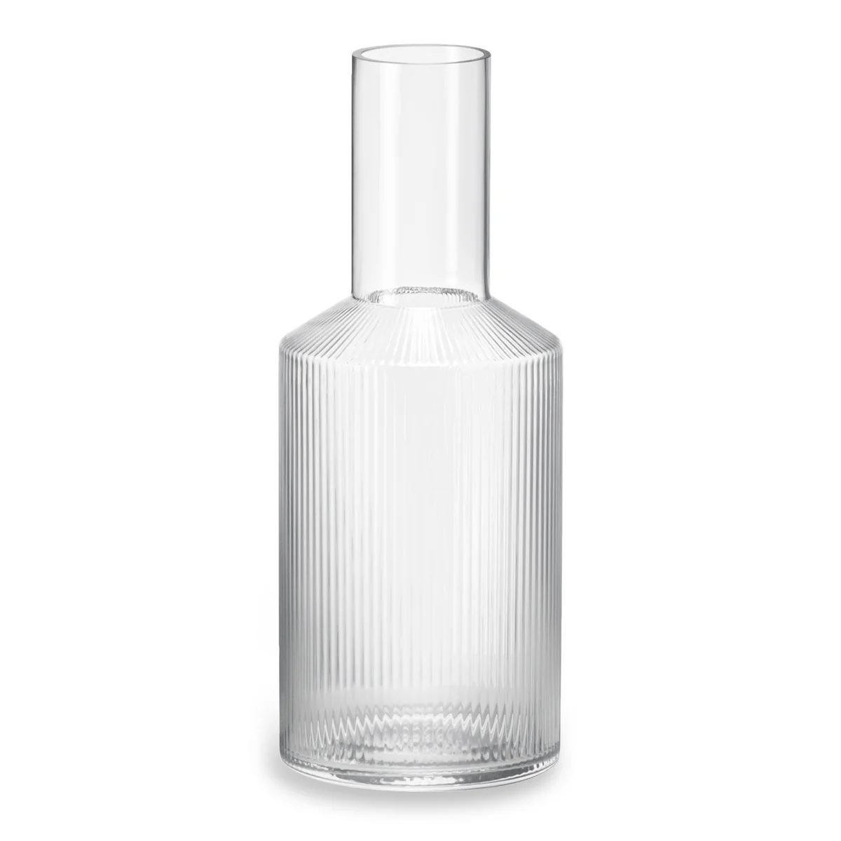 Die Karaffe von Ferm Living gehört zu der Ripple Geschirr-Serie, die mit ihrer geriffelten Oberfläche eine moderne Optik bietet. Die praktische und schöne Karaffe wird aus mundgeblasenem Glas hergestellt. Die Riffel sind dabei nicht nur eine optisch ansprechende Komponente, sondern sorgen zudem für einen sicheren und rutschfestem Griff.