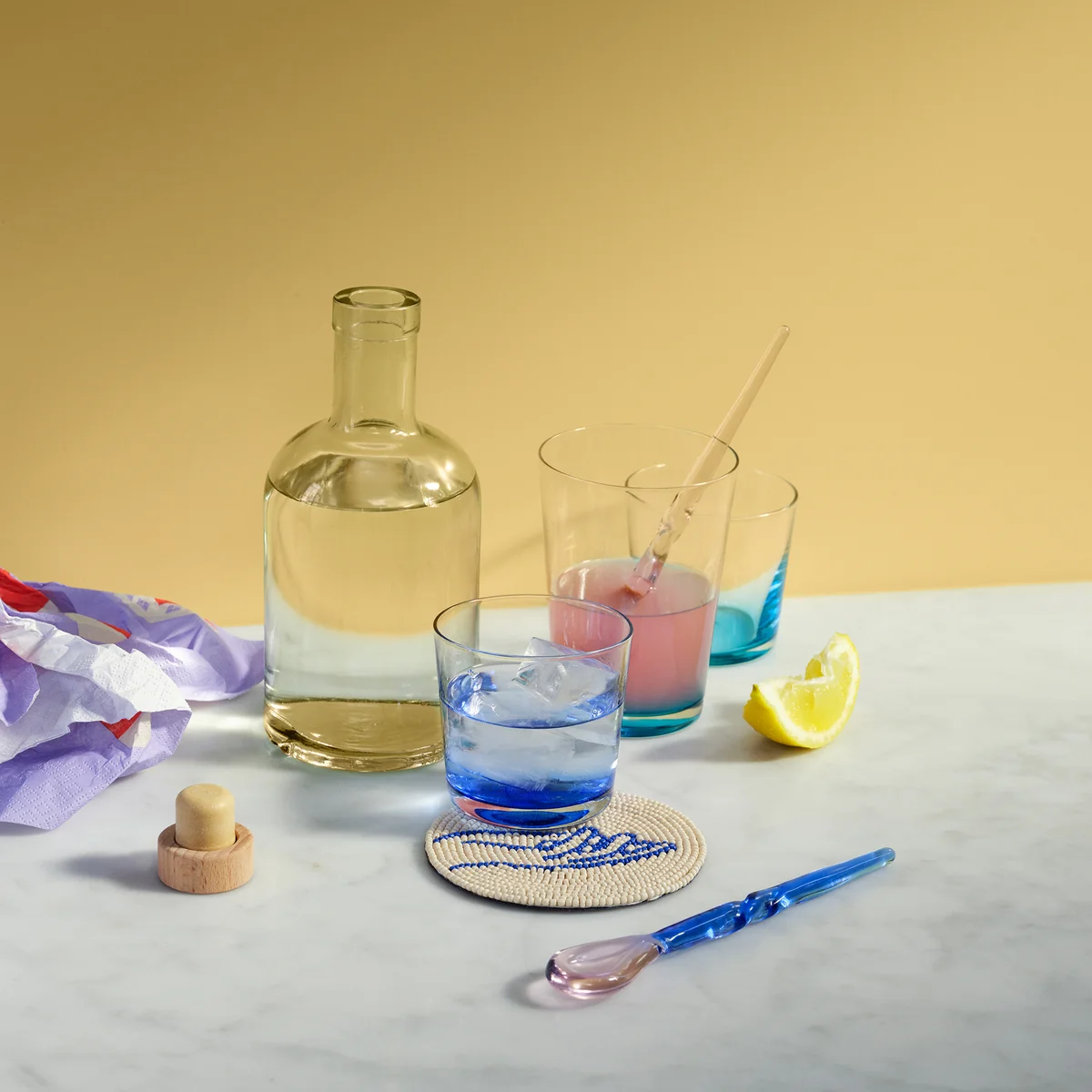 Die Hue Karaffe aus dem Hause Broste Copenhagen besticht mit seiner klassischen Optik. Den modernen Touch stellt die bunte Färbung des Untergrunds der Karaffe dar. Sie wird aus mundgeblasenem Glas gefertigt, wodurch es zu Abweichungen hinsichtlich der Größe und Form kommen kann. Jedes Stück ist demnach ein Unikat. Hue kann optimal in den Mittelpunkt eines eleganten Tischgedecks integriert werden. Ideal kombinierbar mit dem Hue Trinkglas.