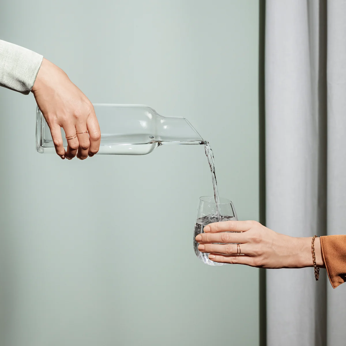 Übrigens passt die Glaskaraffe mit 1l Fassungsvermögen hervorragend in die Kühlschranktür, sodass sich auch gekühlte Getränke daraus genießen lassen.
