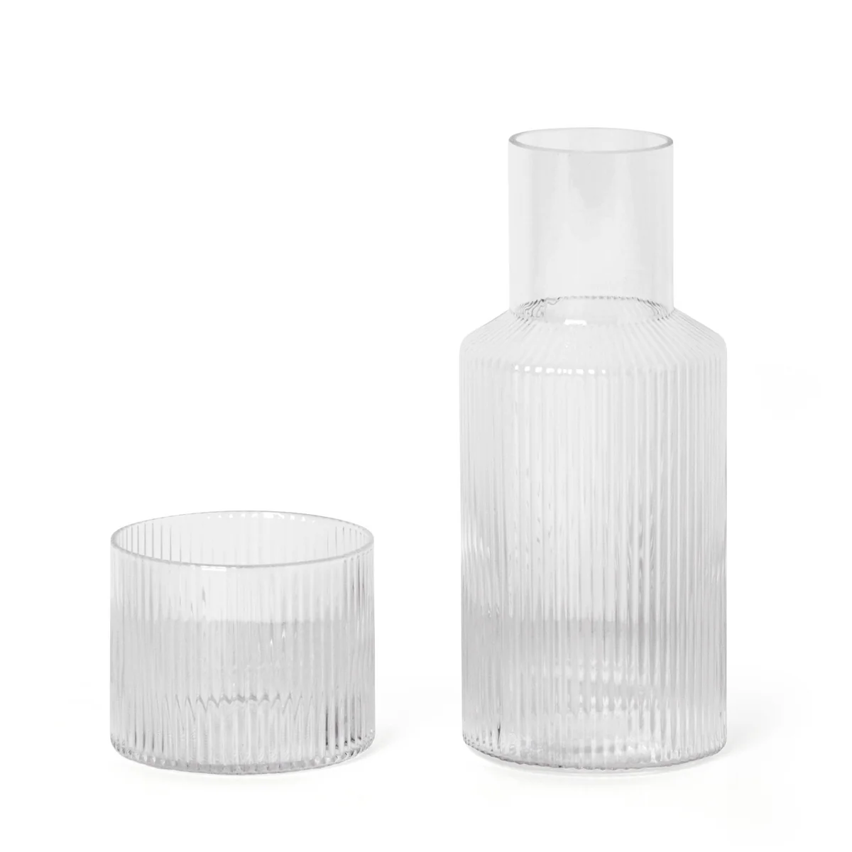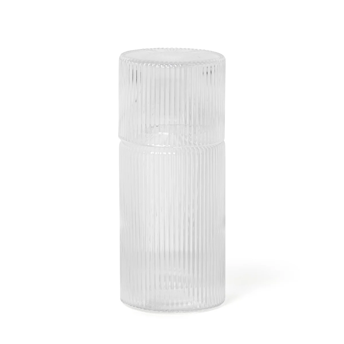 Das kleine Ripple Karaffen-Set von Ferm Living besteht aus einer Karaffe und einem Glas. Das markante Rillenmuster von Karaffe und Glas macht sich toll auf dem Schreibtisch im Büro, auf dem Esstisch im Wohnzimmer oder auf dem Tisch in der Küche. Das Set sorgt für einen tollen Hingucker und versorgt einen den ganzen Tag über mit ausreichend Wasser.
