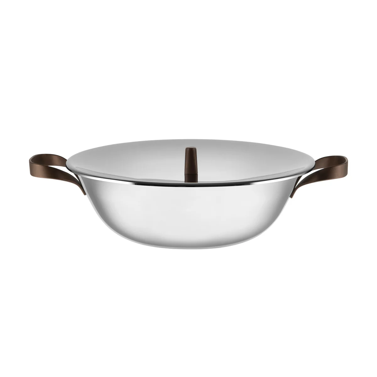 Der Wok wird aus Multiply (AISI 430, Aluminium, Edelstahl 18/10) mit einem Deckel aus Edelstahl 18/10 hergestellt. Die Griffe aus Edelstahl 18/10 sind mit einer PVD Beschichtung in Braun versehen und erinnern optisch an Lederriemen. Der Magnetboden aus Stahl eignet sich für alle Herdarten. So kann der Wok auch auf Induktionsherden verwendet werden.