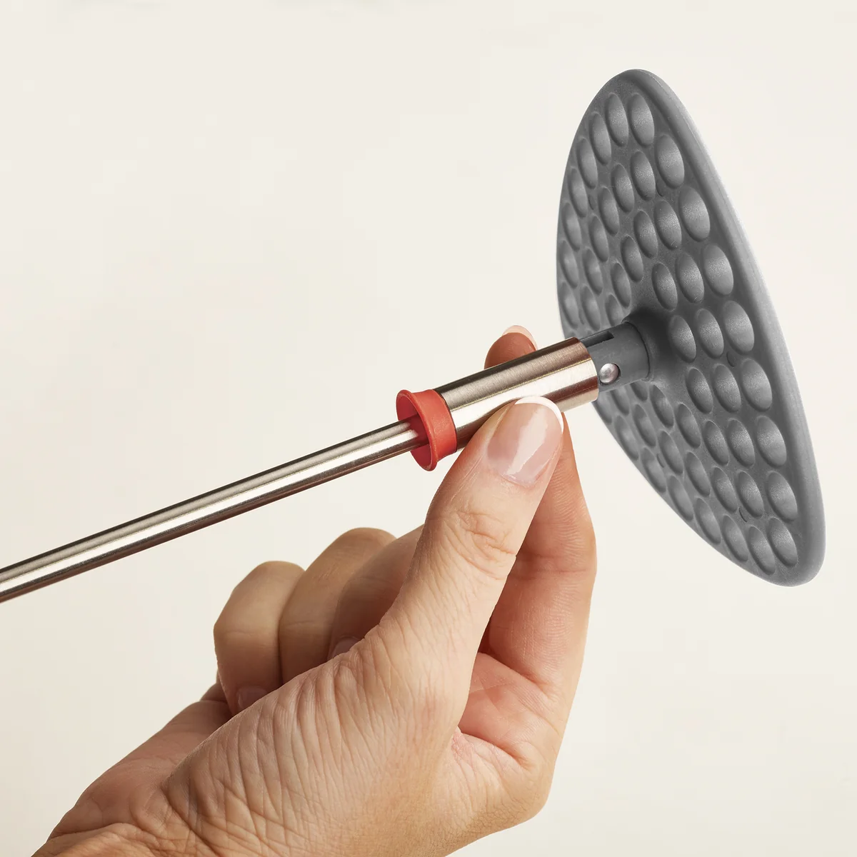 Der Stampfer ist so geformt, dass er sich an die runde Form der Töpfe optimal anpasst um Kartoffeln und Co. leicht zerdrücken zu können. Mithilfe eines kleinen Schieberiegels wird der Stampfer am Griff vertikal verriegelt und wieder gelöst, um den Kopf einfach wegzuklappen.