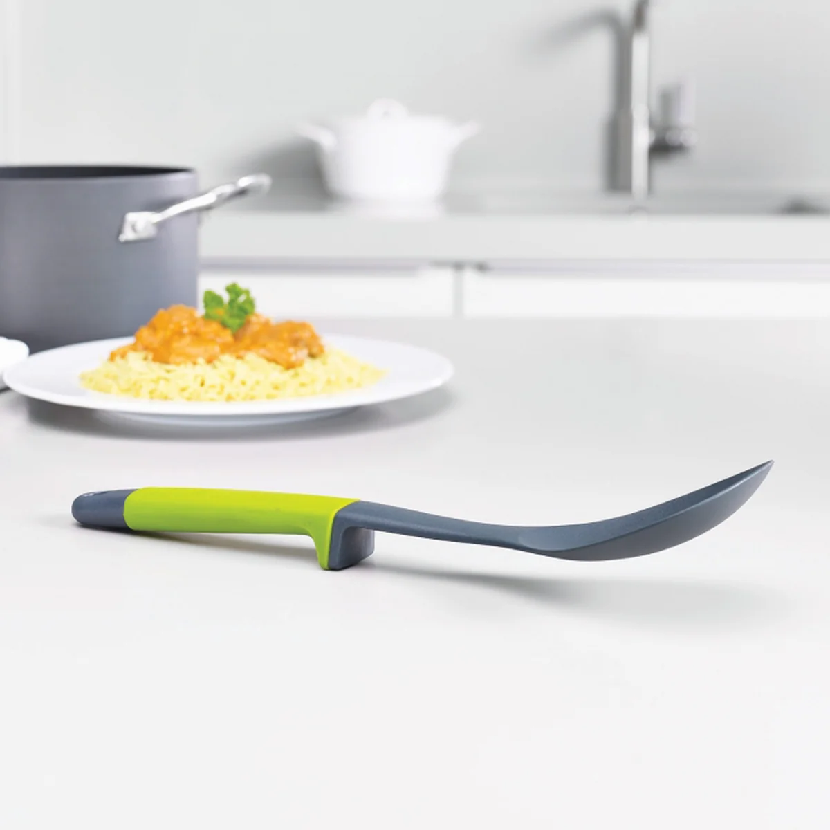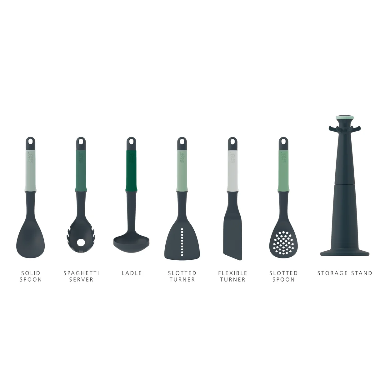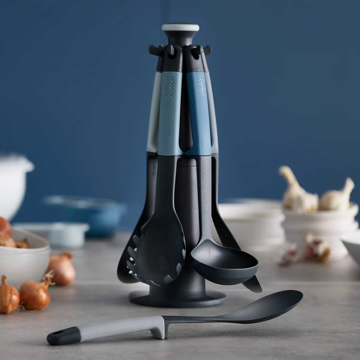 Die Serie Elevate von Joseph Joseph besteht aus sechs zentralen Küchenwerkzeugen: Schöpfkelle, Lochkelle, gelochter Pfannenwender, Spaghetti-Löffel, Kochlöffel und Pfannenwender. Die Werkzeuge besitzen in ihrem ergonomisch geformten Griff ein Loch, so dass sie bequem an den Standfuß des Elevate Karussels gehängt werden können.