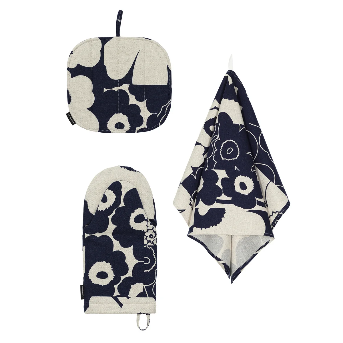 Das Unikko Kollaasi Küchenset von Marimekko besteht aus einem Ofenhandschuh, einem Topflappen und einem Küchentuch, die alle aus einem ungebleichten Baumwoll-Leinen-Gemisch hergestellt und in Helsinki sorgfältig bedruckt wurden. Der Ofenhandschuh und der Topflappen haben eine gepolsterte Füllung und Aufhängeschlaufen, während das Küchentuch eine Aufhängeschlaufe an der langen Kante hat.