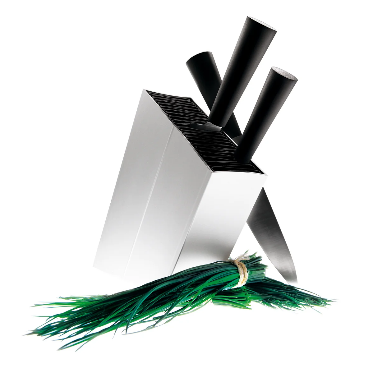 Der Messerblock von Eva Solo wurde von den Designern Claus Jensen und Henrik Holbæk von Tools Design entworfen. In der aus poliertem Aluminium bestehenden Hülle des Messerblocks befindet sich zu Schlangenlinien geformter Kunststoff, in dessen Falten Sie Ihre Küchengeräte - nicht nur die Messer - stecken können. Der Falteinsatz ist herausnehmbar und leicht zu reinigen, was bei herkömmlichen Blöcken oft nicht möglich ist.