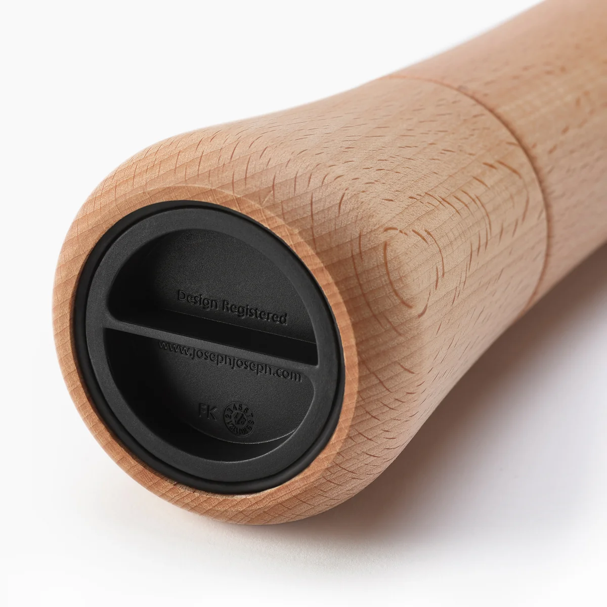 Die Milltop™ Wood Salz- und Pfeffermühle aus dem britischen Hause Joseph Joseph begeistern mit ihrem simplen, gleichzeitig jedoch überaus edlem Design. Das häufig lästige Mahlgut, welches aus herkömmlichen Mühlen herausbröckelt, stellt ein unschönes Bild in der Küche dar. Das Milltop™-Design hingegen umgeht dieses Problem. Das Mahlwerk befindet sich im oberen Teil der Mühle, wodurch der überschüssige Salz und Pfeffer zurück ins Innere der Mühle fällt. Dank des Drehens der Edelstahlscheibe kann je nach Präferenz der Mahlgrad simpel eingestellt werden. Die minimalistischen Mühlen werden aus natürlichem Buchenholz gefertigt. Das robuste Mahlwerk besteht aus Keramik.