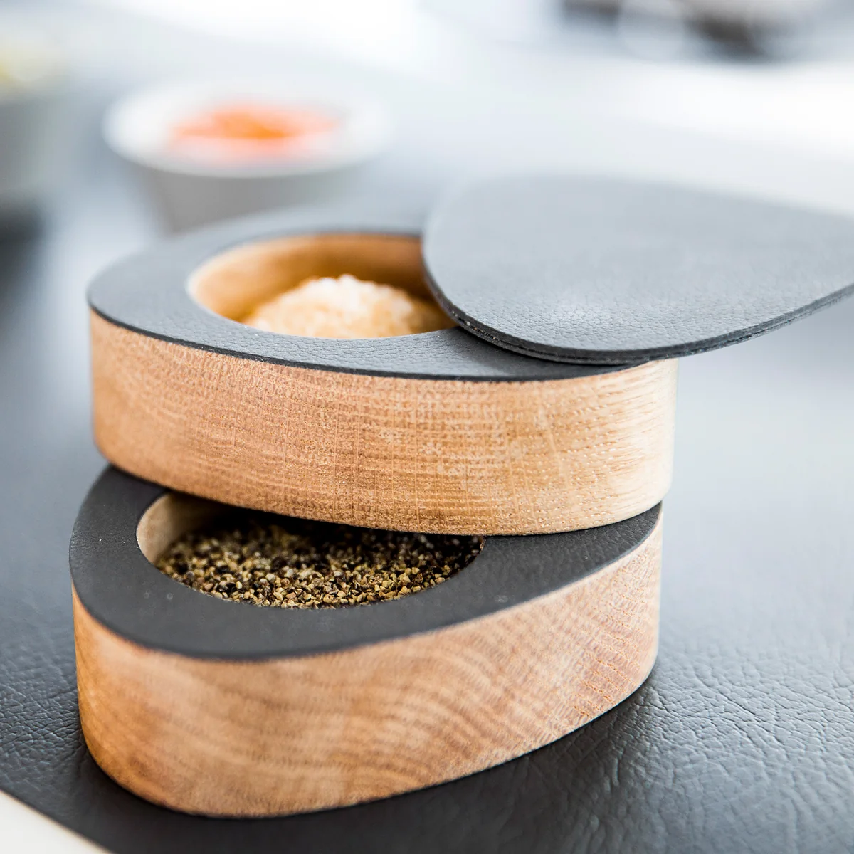 Die Aufbewahrung wird aus Eichenholz hergestellt und hat einen Bezug aus recyceltem Leder. In verschiedenen Farben erhältlich, fügt sich die Aufbewahrung so gut in jedes Ambiente ein. Die Aufbewahrung eignet sich nicht nur für Salz und Pfeffer, sondern auch für Gewürze oder im Büro zur Aufbewahrung kleinerer Gegenstände wie Büroklammern.