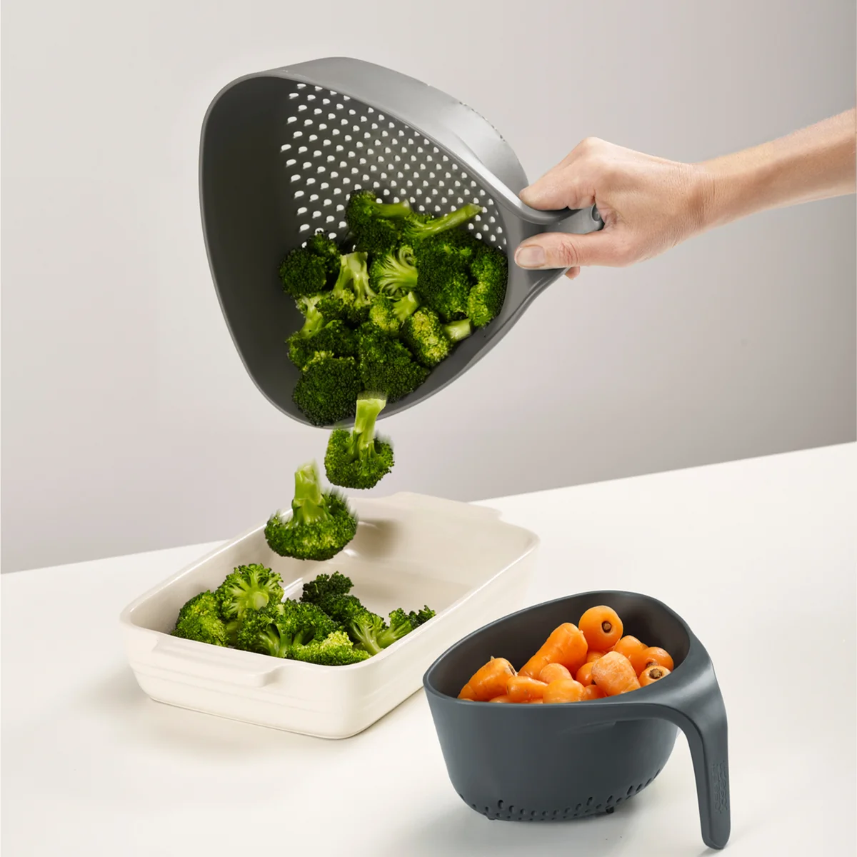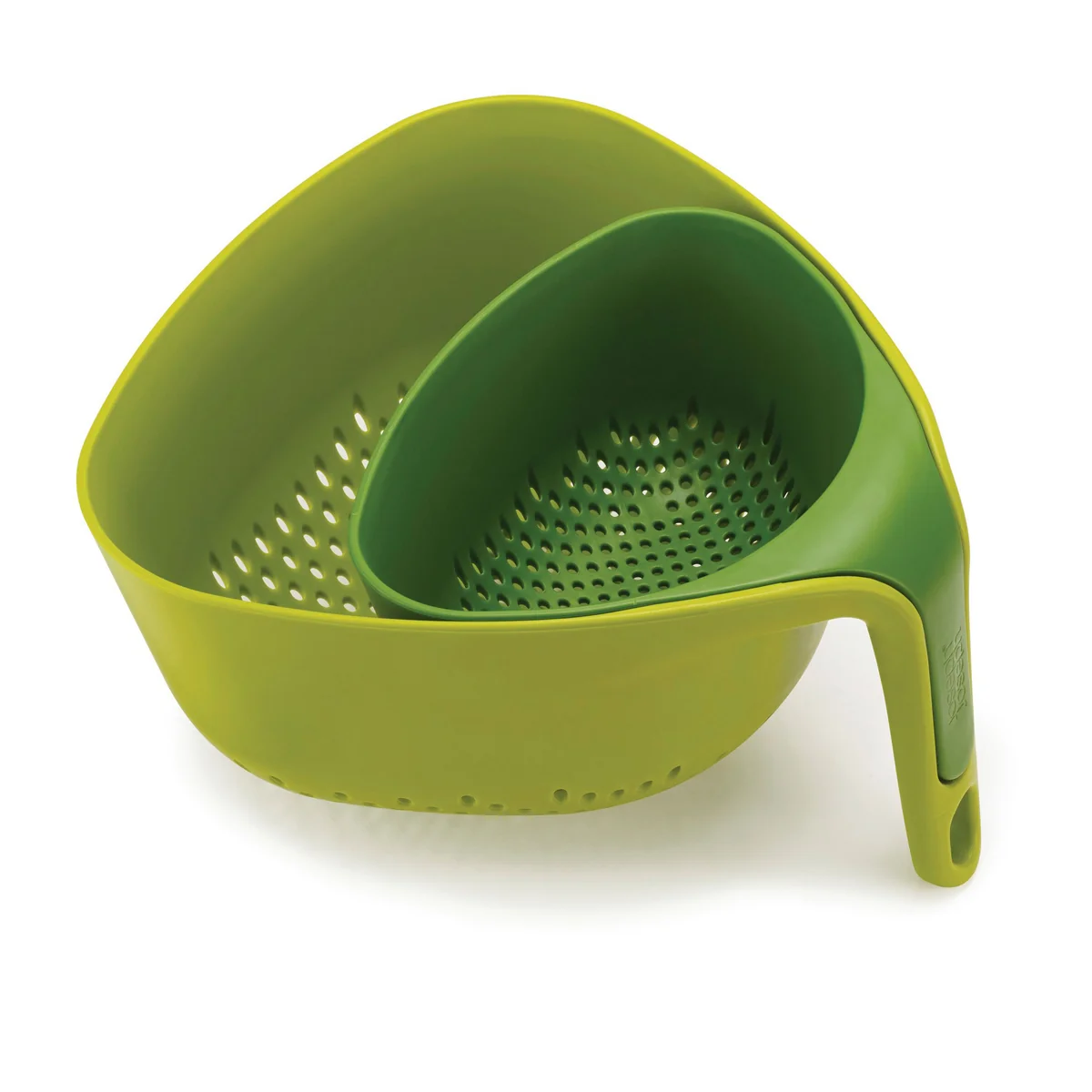 Der eckige Nest Durchschlag von Joseph Joseph besitzt gleich mehrere einzigartige Funktionen. Erstens sorgt der senkrechte Griff dafür, dass er in der Spüle stabil und aufrecht stehenbleibt und dabei eine Hand zum Bedienen des Wasserhahns frei bleibt. Zweitens ermöglicht die dreieckige Form ein leichteres und präziseres Ausleeren der Lebensmittel und Speisen. Drittens fließen Flüssigkeiten durch die senkrechten Löcher schnell und effizient ab.