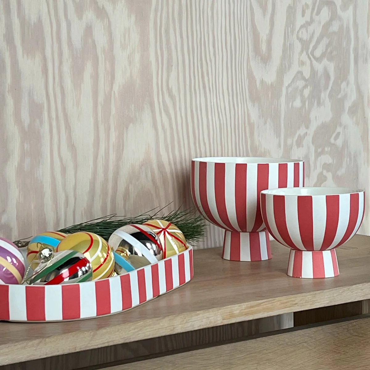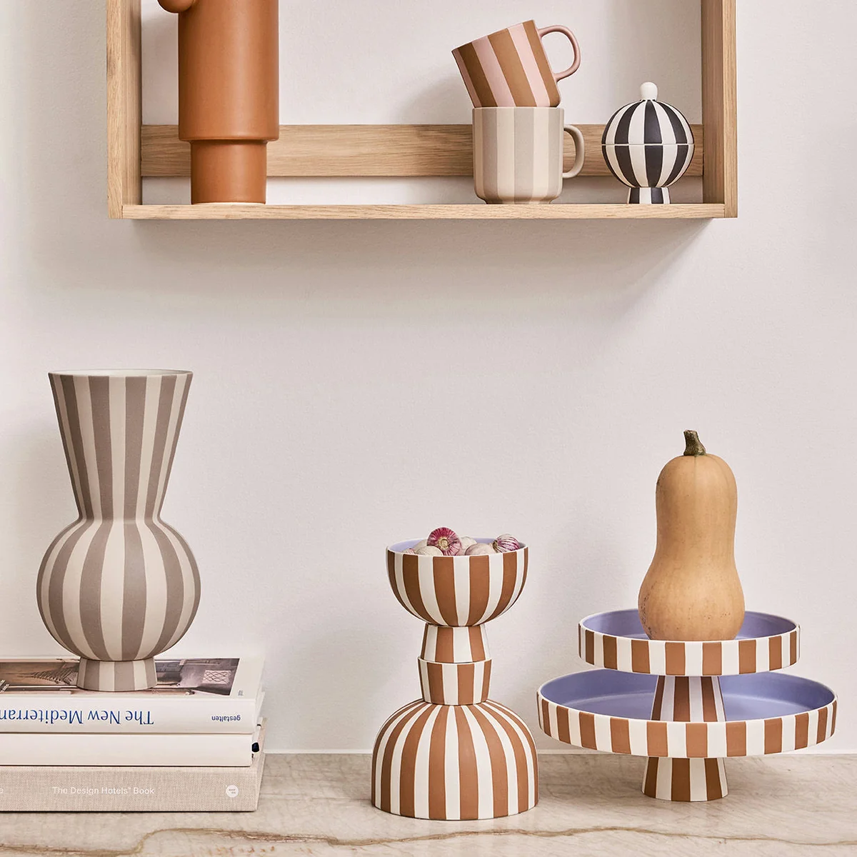Das Toppu Tablett von OYOY zeichnet sich durch seinen verspielten Streifen-Look aus, der für einen tollen Blickfang auf dem Esstisch oder dem Sideboard sorgt. Als klassische Etagere genutzt, lassen sich Snacks und Süßigkeiten für Gäste oder die Familie ansprechend darauf servieren. Doch auch als Aufbewahrung für Schmuck und Kosmetik kann das Toppu Tablett wunderbar genutzt werden.