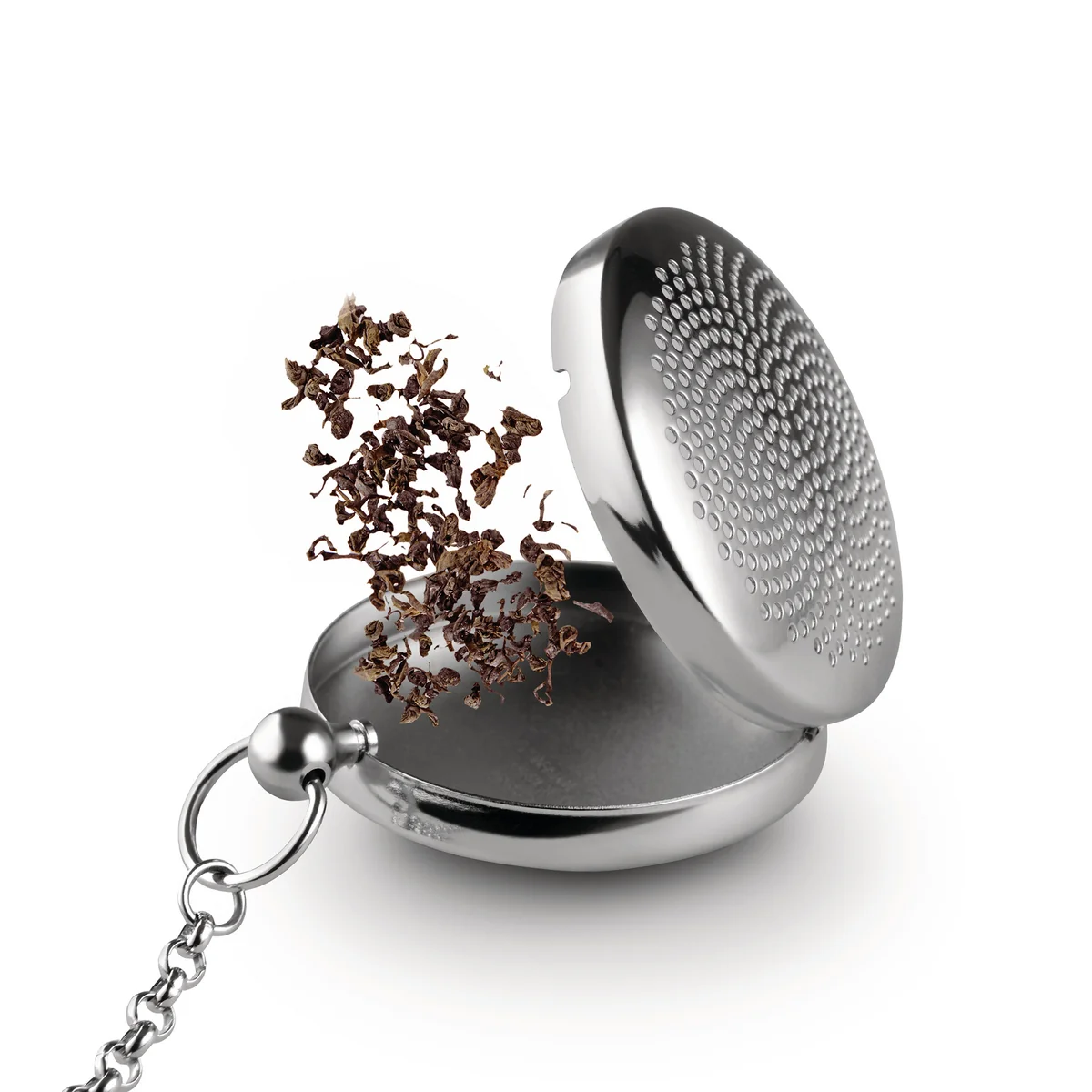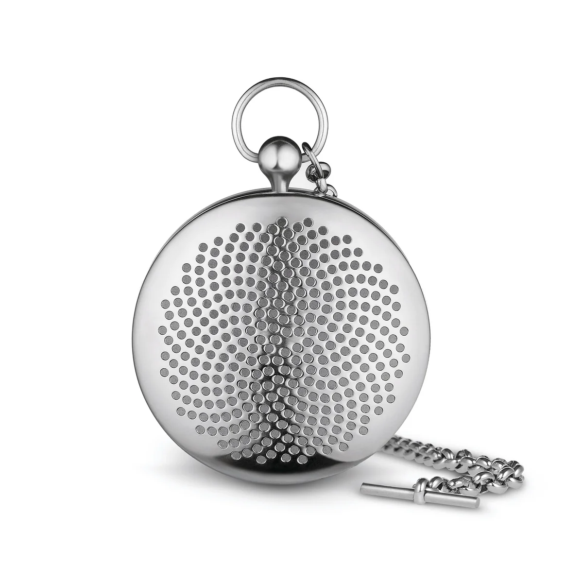 Das Ei hat eine nahezu einladende Wirkung auf Tee-Liebhaber, sich für ein paar entspannte Minuten dem Geschmack ihres aufgebrühten Tees hinzugeben. Dank der einfachen Bedienung kann das T-Timepiece Tee-Ei schnell befüllt und in der Tasse oder der Kanne mit heißem Wasser aufgegossen werden. Die kleinen, runden Löcher, durch die das Wasser fließen kann, bilden zudem ein interessantes Muster auf dem glänzenden Edelstahlgehäuse.