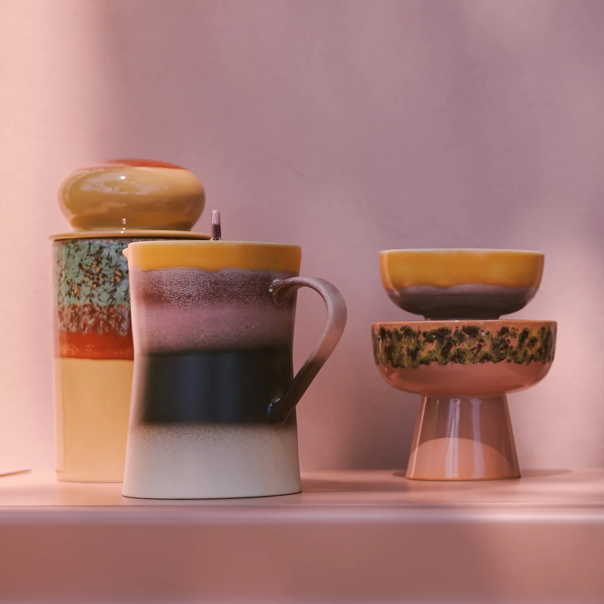 Die Teekanne wird aus robuster Keramik hergestellt und kann in der Spülmaschine gereinigt werden. Ergänzt wird die Teekanne durch Tassen, Becher, Schalen und Teller der verspielten und dekorativen 70's Geschirr-Serie.