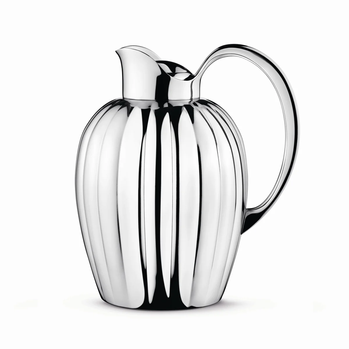 Die schlanken Linien am Korpus der Georg Jensen Bernadotte Thermoskanne sind eine Anlehnung an frühere Designs von Silbergedecken, die Kanne wirkt aber dennoch elegant und zeitlos. Bernadotte passt sowohl zu einem königlich gedeckten Tisch als auch zu jedem einfachen Frühstückstisch. Die Warmhaltekanne ist ein edles und sehr haltbares Warmhaltegerät, das seine Funktion durch seine elegante Erscheinung nicht sofort verrät.