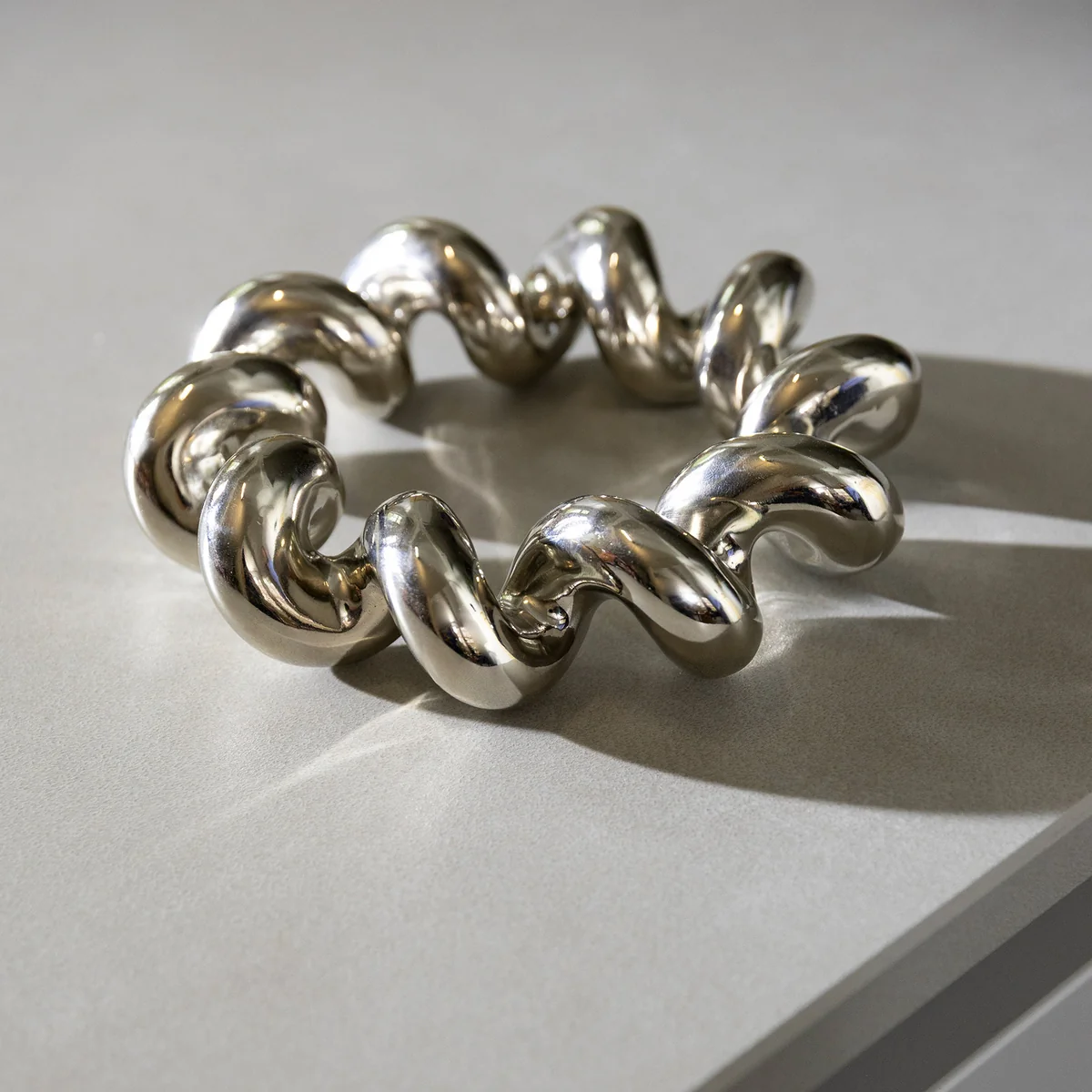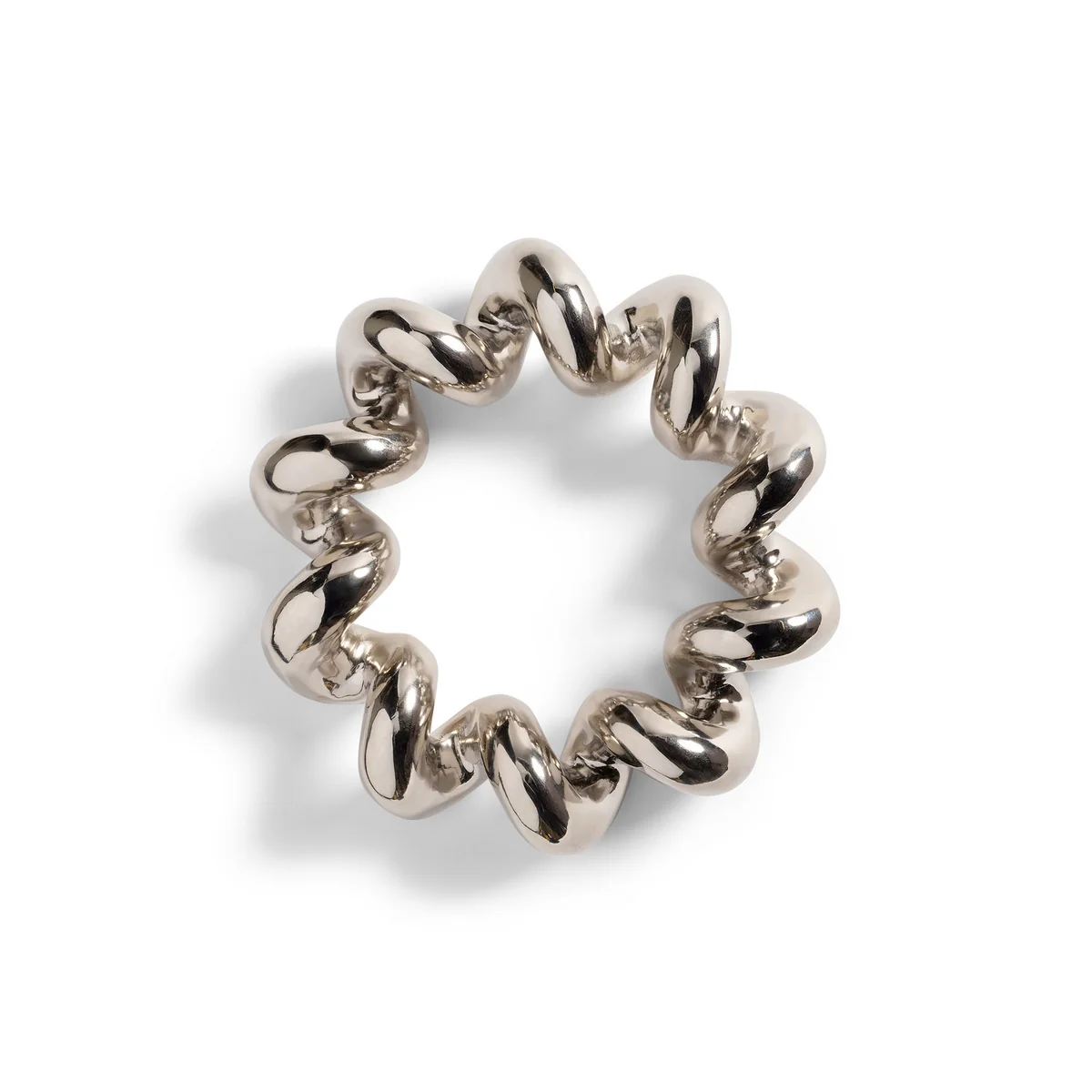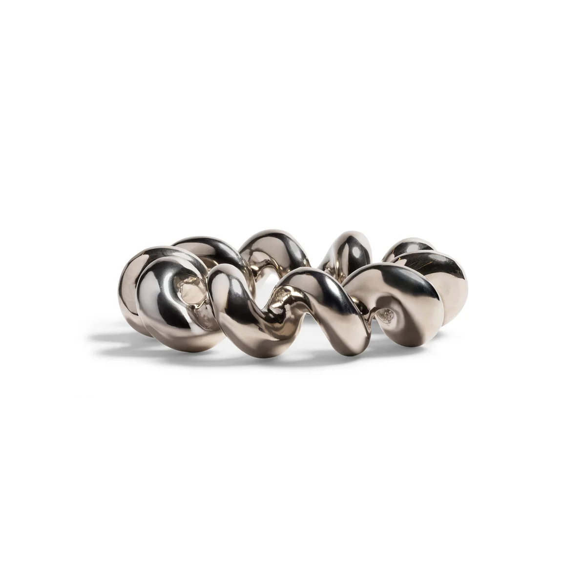 Der Twist Topfuntersetzer vereint praktischen Hitzeschutz mit moderner Formensprache. Die verdrehte, geometrische Gestaltung verleiht dem Untersetzer eine skulpturale Präsenz, während das verchromte, hitzebeständige Finish Oberflächen zuverlässig schützt. Aus Metall gegossen, ist er stabil und langlebig – ein stilvolles Accessoire für Küche und Esstisch.
