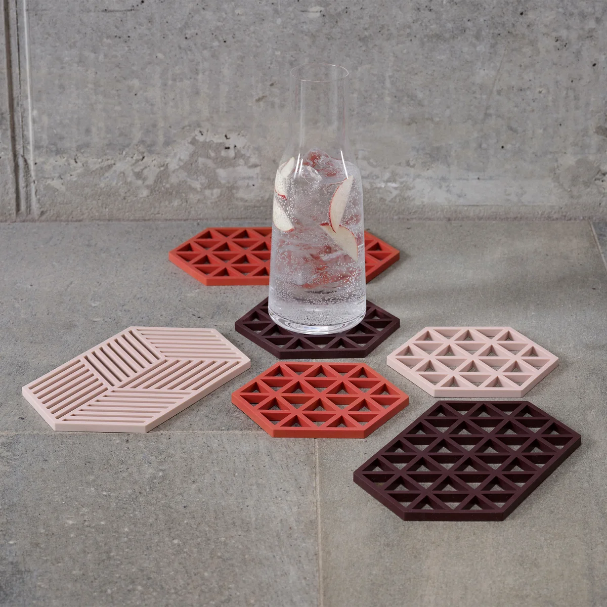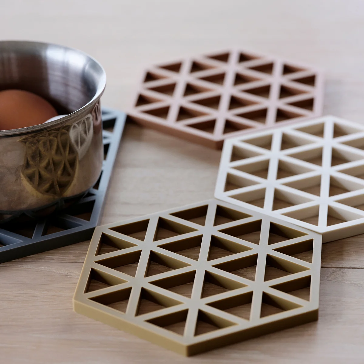 Die Untersetzer können je nach Bedarf auch zu mehreren aneinandergelegt werden, sodass auch größere Töpfe ihren Platz darauf finden. Gleichzeitig entsteht ein tolles Muster aus Sechsecken und Dreiecken, das für einen echten Hingucker sorgt.