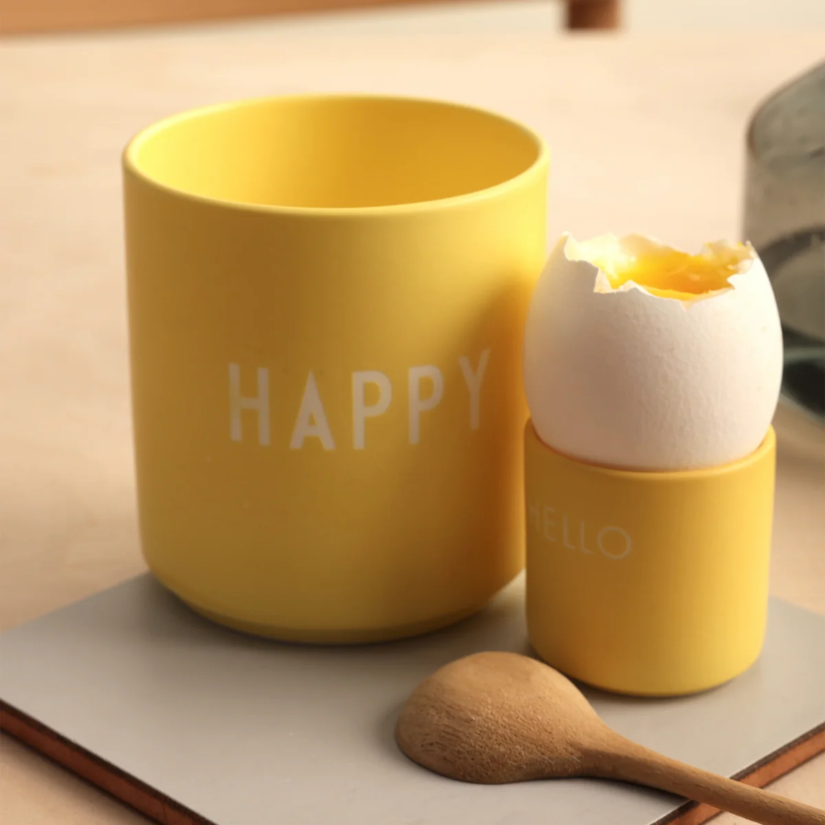 Ob als Tassen für Tee oder Kaffee auf dem Esstisch oder als Stifthalter auf dem Schreibtisch - die Becher sorgen mit ihren positiven Wörtern für ein Lächeln am Morgen oder die nötige Motivation zum Arbeiten. Hergestellt werden die Becher aus Porzellan während die Buchstaben eingraviert sind. Die grafischen Tassen sorgen für einen Farbtupfer im Wohnbereich und eignen sich auch bestens als Geschenk.