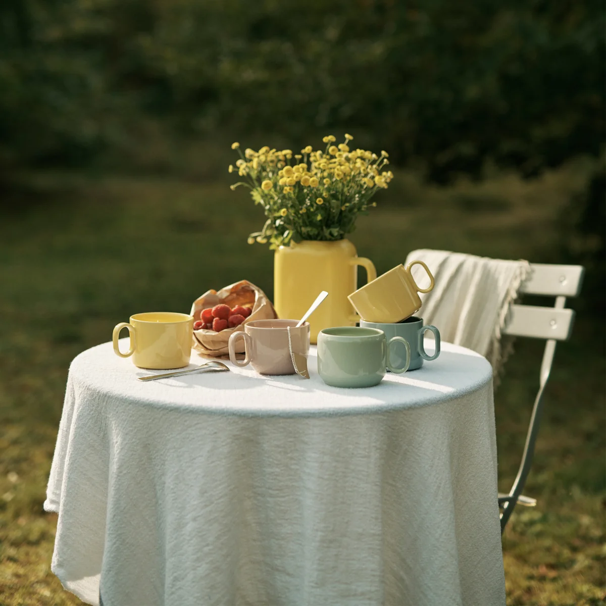 Die Becher mit Henkel mit einem Fassungsvermögen von 290 ml werden aus Steingut hergestellt. Innen und außen glasiert sind die Tassen in der Geschirrspülmaschine leicht zu reinigen und auch mikrowellenfest.