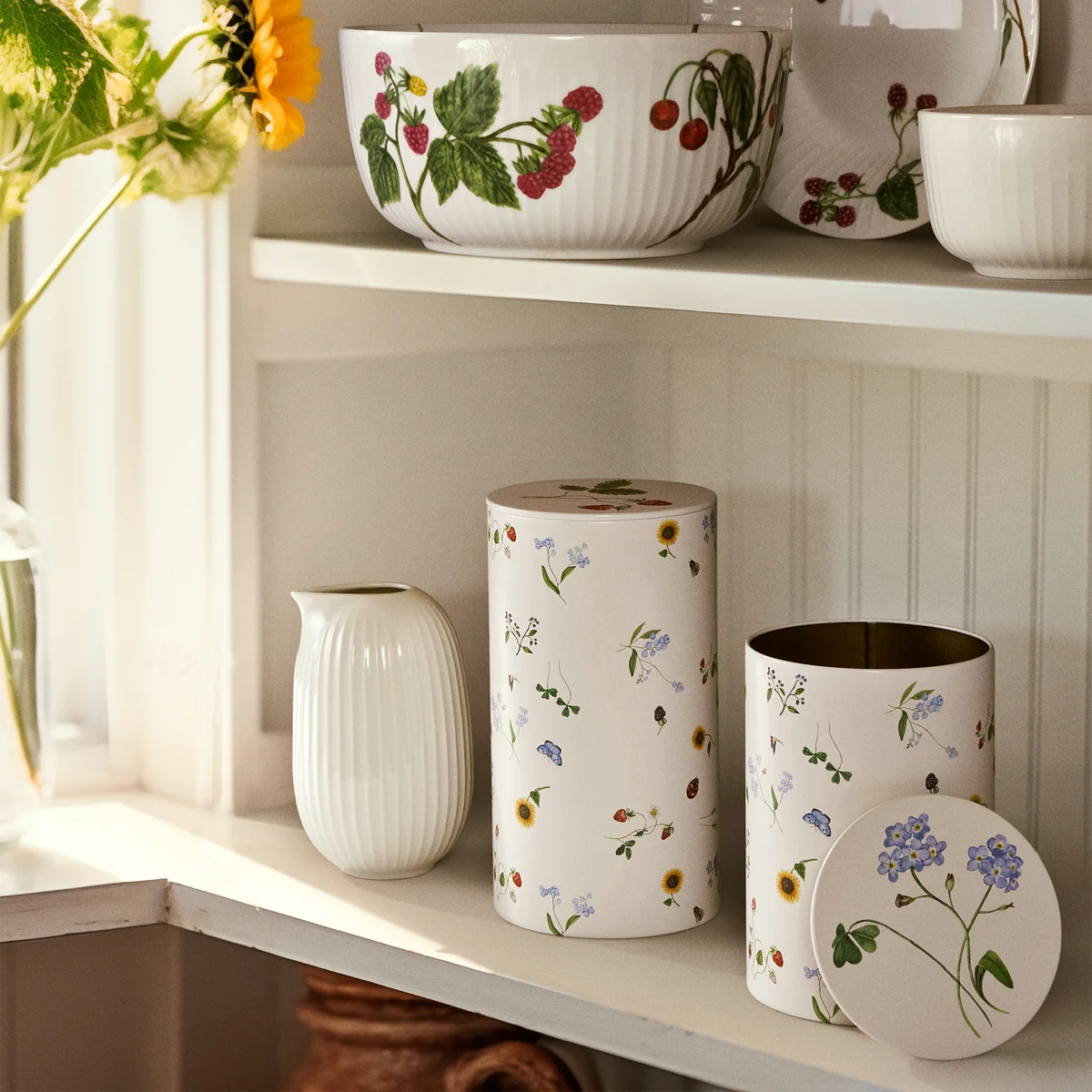 Die Hammershøi Summer Vorratsdose von Kähler Design, verbindet funktionale Aufbewahrung mit eleganter, skandinavischer Ästhetik. Die ikonische Hammershøi-Rillenstruktur trifft auf ein zartes, handgemaltes Blumen- und Naturmotiv, das an die Leichtigkeit des Sommers erinnert.