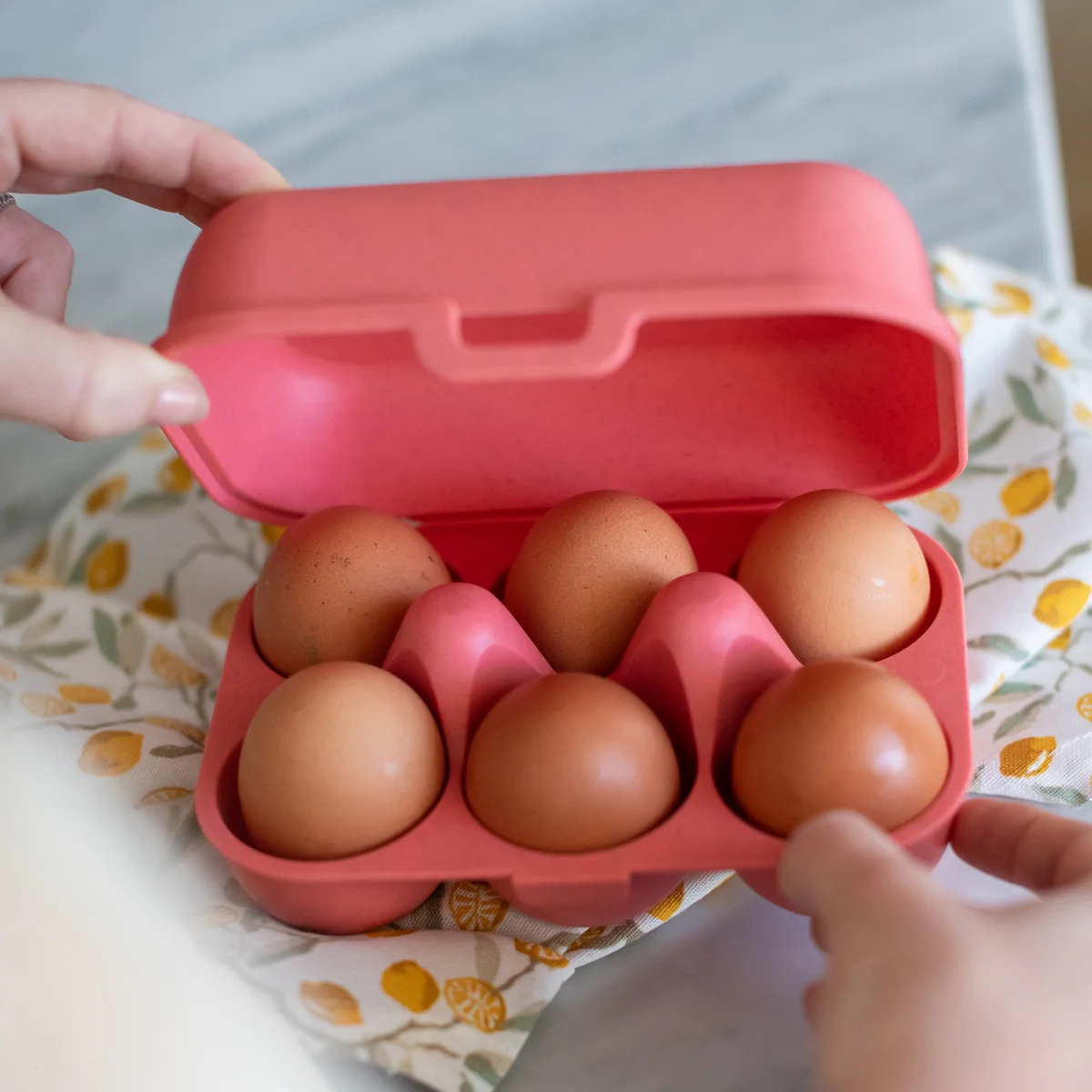 Eggs to go von Koziol ist ein praktischer Mehrweg Eierbehälter und der ideale Begleiter für den Einkauf auf dem Markt oder im nächsten Hofladen. In der Box lassen sich wie in einer gewöhnlichen Eierpappe bis zu 10 Eier sicher nachhause transportieren. Und das ohne zusätzliche Einwegverpackung. Ein praktischer Clipverschluss dient zum einfachen Öffnen und Schließen der Eierbox und verhindert das ungewollte Aufgehen des Behälters während des Transports.