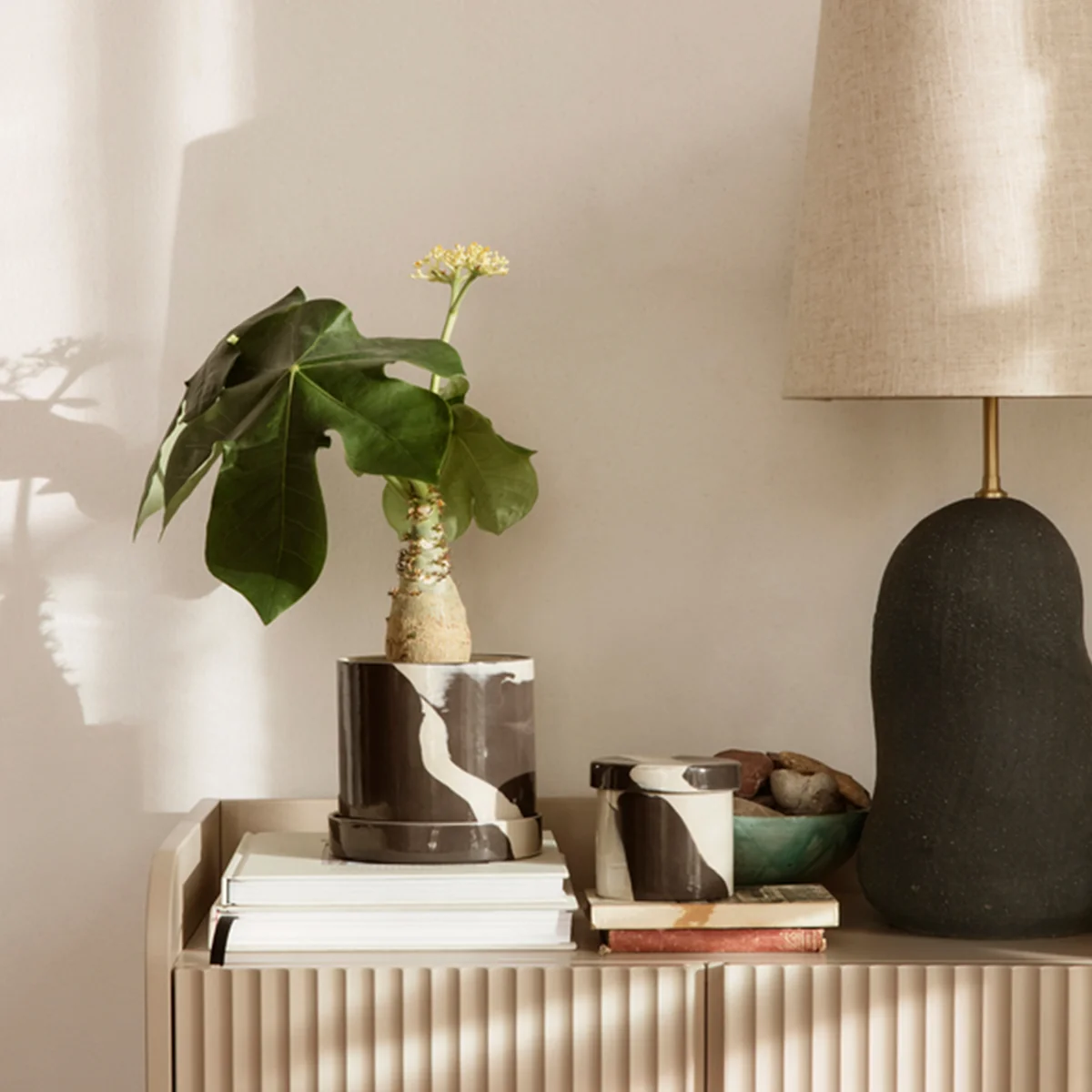 Der Inlay Steinzeug Behälter von Ferm Living sticht durch seine zweifarbige Optik in jeder Einrichtung hervor. Durch die Tonmischung entsteht ein großes marmorähnliches Muster, das jedes Stück zum Unikat macht. Der Behälter in Brauntönen ist individuell einsetzbar. Von der Aufbewahrung von kleineren Dingen auf dem Schreibtisch, über trockene Lebensmittel in der Küche, bis hin zur Verwendung als dekorativer Blumentopf. Inlay ist in jeden Raum eine praktische Ergänzung.