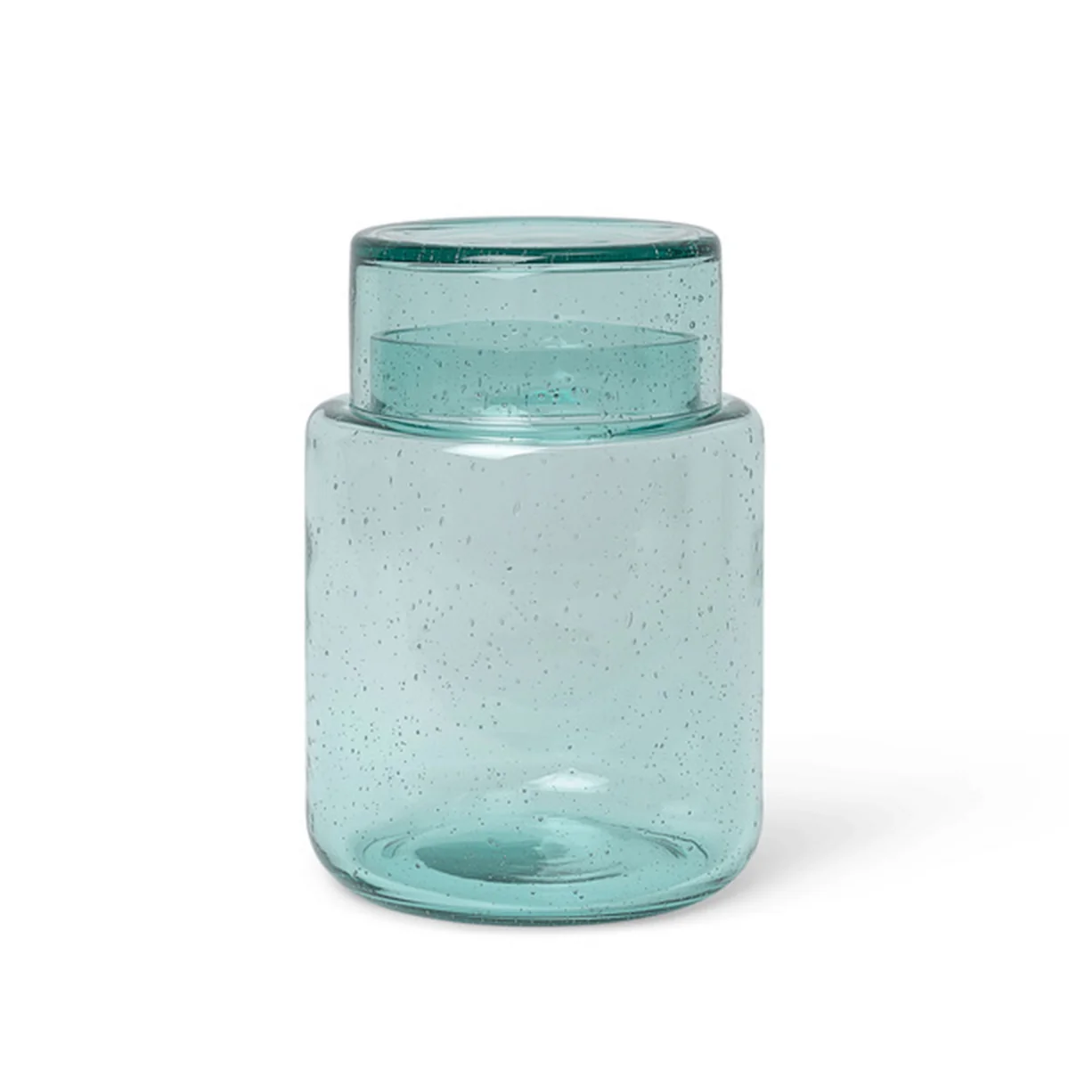 Der Oli Glasbehälter von Ferm Living wird zu 100 % aus recyceltem Glas gefertigt. Auffällig sind die vielen kleinen Blasen im Glas, die durch absichtliche Lufttaschen zwischen den Schichten des mundgeblasenen Glases entstehen.